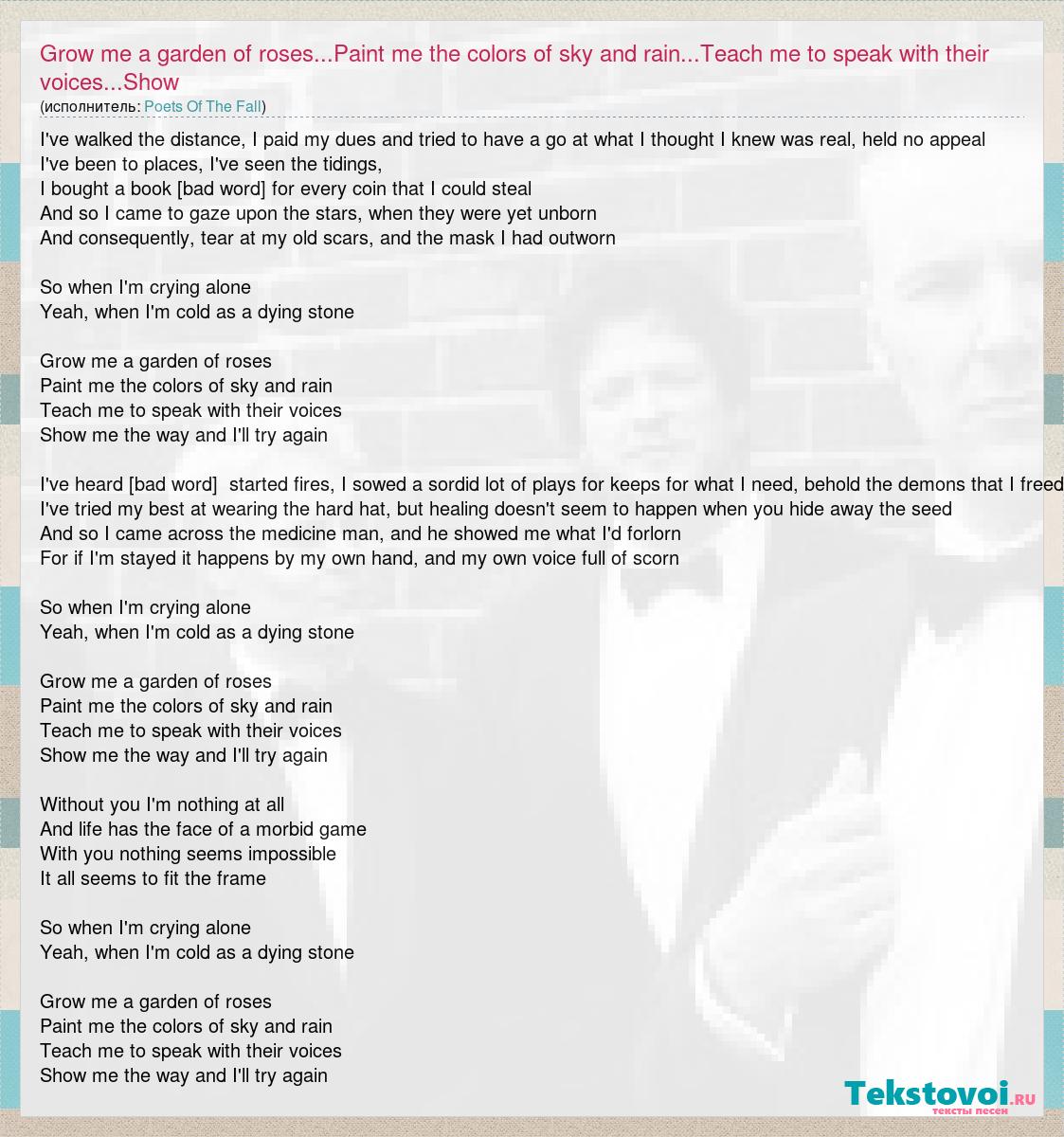 I've walked the distance, I paid my dues and tried to have a go at what I thought I knew was real, held no appeal I've been to places, I've seen the tidings, I bought a book of rules for every coin that I could steal And so I came to gaze upon the stars, when they were yet unborn And consequently, tear at my old scars, and the mask I had outworn So when I'm crying alone Yeah, when I'm cold as a dying stone Grow me a garden of roses Paint me the colors of sky and rain Teach me to speak with their voices Show me the way and I'll try again I've heard the rumors, started fires, I sowed a sordid lot of plays for keeps for what I need, behold the demons that I freed I've tried my best at wearing the hard hat, but healing doesn't seem to happen when you hide away the seed And so I came across the medicine man, and he showed me what I'd forlorn For if I'm stayed it happens by my own hand, and my own voice full of scorn So when I'm crying alone Yeah, when I'm cold as a dying stone Grow me a garden of roses Paint me the colors of sky and rain Teach me to speak with their voices Show me the way and I'll try again Without you I'm nothing at all And life has the face of a morbid game With you nothing seems impossible It all seems to fit the frame So when I'm crying alone Yeah, when I'm cold as a dying stone Grow me a garden of roses Paint me the colors of sky and rain Teach me to speak with their voices Show me the way and I'll try again