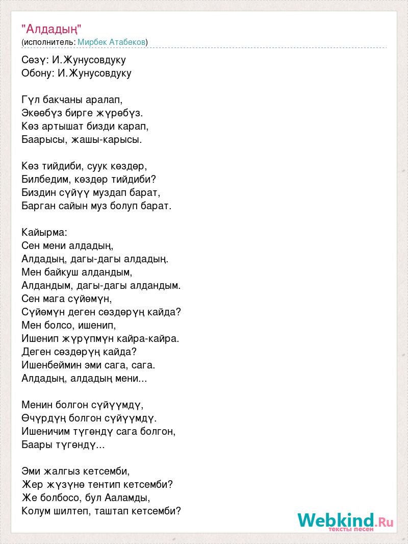 Сөзү: И.Жунусовдуку Обону: И.Жунусовдуку Гүл бакчаны аралап, Экөөбүз бирге жүрөбүз. Көз артышат бизди карап, Баарысы, жашы-карысы. Көз тийдиби, суук көздөр, Билбедим, көздөр тийдиби? Биздин сүйүү муздап барат, Барган сайын муз болуп барат. Кайырма: Сен мени алдадың, Алдадың, дагы-дагы алдадың. Мен байкуш алдандым, Алдандым, дагы-дагы алдандым. Сен мага сүйөмүн, Сүйөмүн деген сөздөрүң кайда? Мен болсо, ишенип, Ишенип жүрүпмүн кайра-кайра. Деген сөздөрүң кайда? Ишенбеймин эми сага, сага. Алдадың, алдадың мени... Менин болгон сүйүүмдү, Өчүрдүң болгон сүйүүмдү. Ишеничим түгөндү сага болгон, Баары түгөндү... Эми жалгыз кетсемби, Жер жүзүнө тентип кетсемби? Же болбосо, бул Ааламды, Колум шилтеп, таштап кетсемби?
