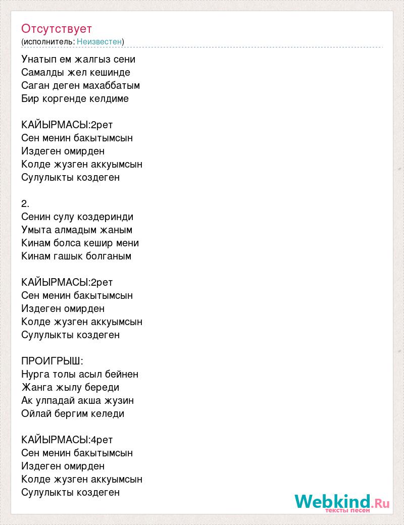 Унатып ем жалгыз сени Самалды жел кешинде Саган деген махаббатым Бир коргенде келдиме КАЙЫРМАСЫ:2рет Сен менин бакытымсын Издеген омирден Колде жузген аккуымсын Сулулыкты коздеген 2. Сенин сулу коздеринди Умыта алмадым жаным Кинам болса кешир мени Кинам гашык болганым КАЙЫРМАСЫ:2рет Сен менин бакытымсын Издеген омирден Колде жузген аккуымсын Сулулыкты коздеген ПРОИГРЫШ: Нурга толы асыл бейнен Жанга жылу береди Ак улпадай акша жузин Ойлай бергим келеди КАЙЫРМАСЫ:4рет Сен менин бакытымсын Издеген омирден Колде жузген аккуымсын Сулулыкты коздеген