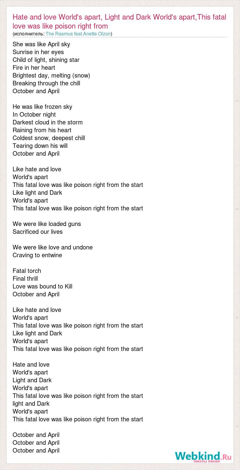 She was like April sky Sunrise in her eyes Child of light, shining star Fire in her heart Brightest day, melting (snow) Breaking through the chill October and April He was like frozen sky In October night Darkest cloud in the storm Raining from his heart Coldest snow, deepest chill Tearing down his will October and April Like hate and love World's apart This fatal love was like poison right from the start Like light and Dark World's apart This fatal love was like poison right from the start We were like loaded guns Sacrificed our lives We were like love and undone Craving to entwine Fatal torch Final thrill Love was bound to Kill October and April Like hate and love World's apart This fatal love was like poison right from the start Like light and Dark World's apart This fatal love was like poison right from the start Hate and love World's apart Light and Dark World's apart This fatal love was like poison right from the start light and Dark World's apart This fatal love was like poison right from the start October and April October and April October and April