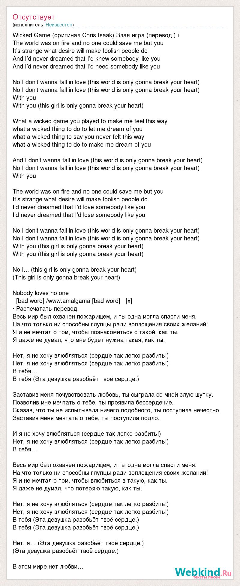 Wicked Game (оригинал Chris Isaak) Злая игра (перевод ) i The world was on fire and no one could save me but you It’s strange what desire will make foolish people do And I’d never dreamed that I’d knew somebody like you And I’d never dreamed that I’d need somebody like you No I don’t wanna fall in love (this world is only gonna break your heart) No I don’t wanna fall in love (this world is only gonna break your heart) With you With you (this girl is only gonna break your heart) What a wicked game you played to make me feel this way what a wicked thing to do to let me dream of you what a wicked thing to say you never felt this way what a wicked thing to do to make me dream of you And I don’t wanna fall in love (this world is only gonna break your heart) No I don’t wanna fall in love (this world is only gonna break your heart) With you The world was on fire and no one could save me but you It’s strange what desire will make foolish people do I’d never dreamed that I’d love somebody like you I’d never dreamed that I’d lose somebody like you No I don’t wanna fall in love (this world is only gonna break your heart) No I don’t wanna fall in love (this world is only gonna break your heart) With you (this girl is only gonna break your heart) With you (this girl is only gonna break your heart) No I... (this girl is only gonna break your heart) (This girl is only gonna break your heart) Nobody loves no one [bad word] /www.amalgama [bad word] [x] · Распечатать перевод Весь мир был охвачен пожарищем, и ты одна могла спасти меня. На что только ни способны глупцы ради воплощения своих желаний! Я и не мечтал о том, чтобы познакомиться с такой, как ты. Я даже не думал, что мне будет нужна такая, как ты. Нет, я не хочу влюбляться (сердце так легко разбить!) Нет, я не хочу влюбляться (сердце так легко разбить!) В тебя… В тебя (Эта девушка разобьёт твоё сердце.) Заставив меня почувствовать любовь, ты сыграла со мной злую шутку. Позволив мне мечтать о тебе, ты проявила бессердечие. Сказав, что ты не испытывала ничего подобного, ты поступила нечестно. Заставив меня мечтать о тебе, ты поступила подло. И я не хочу влюбляться (сердце так легко разбить!) Нет, я не хочу влюбляться (сердце так легко разбить!) В тебя… Весь мир был охвачен пожарищем, и ты одна могла спасти меня. На что только ни способны глупцы ради воплощения своих желаний! Я и не мечтал о том, чтобы влюбиться в такую, как ты. Я даже не думал, что потеряю такую, как ты. Нет, я не хочу влюбляться (сердце так легко разбить!) Нет, я не хочу влюбляться (сердце так легко разбить!) В тебя (Эта девушка разобьёт твоё сердце.) В тебя (Эта девушка разобьёт твоё сердце.) Нет, я… (Эта девушка разобьёт твоё сердце.) (Эта девушка разобьёт твоё сердце.) В этом мире нет любви…