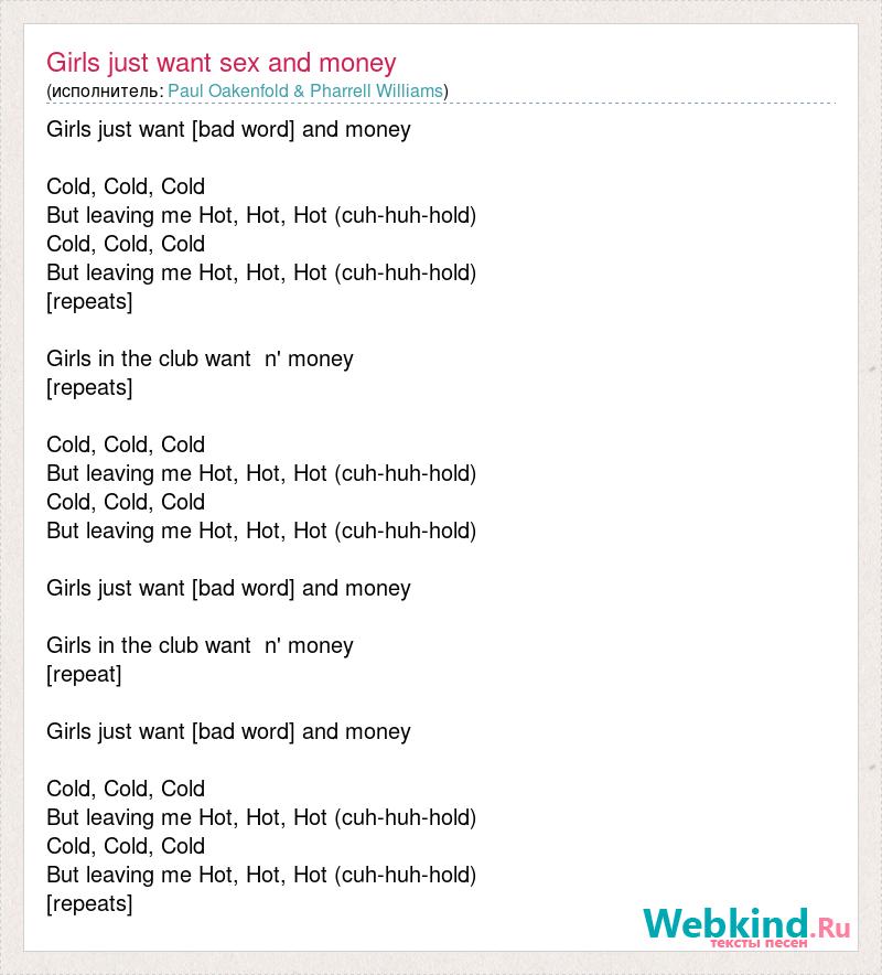 Girls just want [bad word] and money Cold, Cold, Cold But leaving me Hot, Hot, Hot (cuh-huh-hold) Cold, Cold, Cold But leaving me Hot, Hot, Hot (cuh-huh-hold) [repeats] Girls in the club want n' money [repeats] Cold, Cold, Cold But leaving me Hot, Hot, Hot (cuh-huh-hold) Cold, Cold, Cold But leaving me Hot, Hot, Hot (cuh-huh-hold) Girls just want [bad word] and money Girls in the club want n' money [repeat] Girls just want [bad word] and money Cold, Cold, Cold But leaving me Hot, Hot, Hot (cuh-huh-hold) Cold, Cold, Cold But leaving me Hot, Hot, Hot (cuh-huh-hold) [repeats]