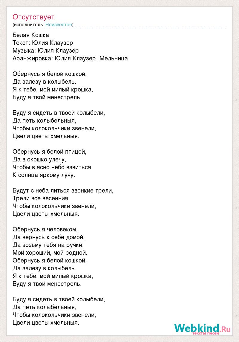 Белая Кошка Текст: Юлия Клаузер Музыка: Юлия Клаузер Аранжировка: Юлия Клаузер, Мельница Обернусь я белой кошкой, Да залезу в колыбель. Я к тебе, мой милый крошка, Буду я твой менестрель. Буду я сидеть в твоей колыбели, Да петь колыбельныя, Чтобы колокольчики звенели, Цвели цветы хмельныя. Обернусь я белой птицей, Да в окошко улечу, Чтобы в ясно небо взвиться К солнца яркому лучу. Будут с неба литься звонкие трели, Трели все весенния, Чтобы колокольчики звенели, Цвели цветы хмельныя. Обернусь я человеком, Да вернусь к себе домой, Да возьму тебя на ручки, Мой хороший, мой родной. Обернусь я белой кошкой, Да залезу в колыбель Я к тебе, мой милый крошка, Буду я твой менестрель. Буду я сидеть в твоей колыбели, Да петь колыбельныя, Чтобы колокольчики звенели, Цвели цветы хмельныя.