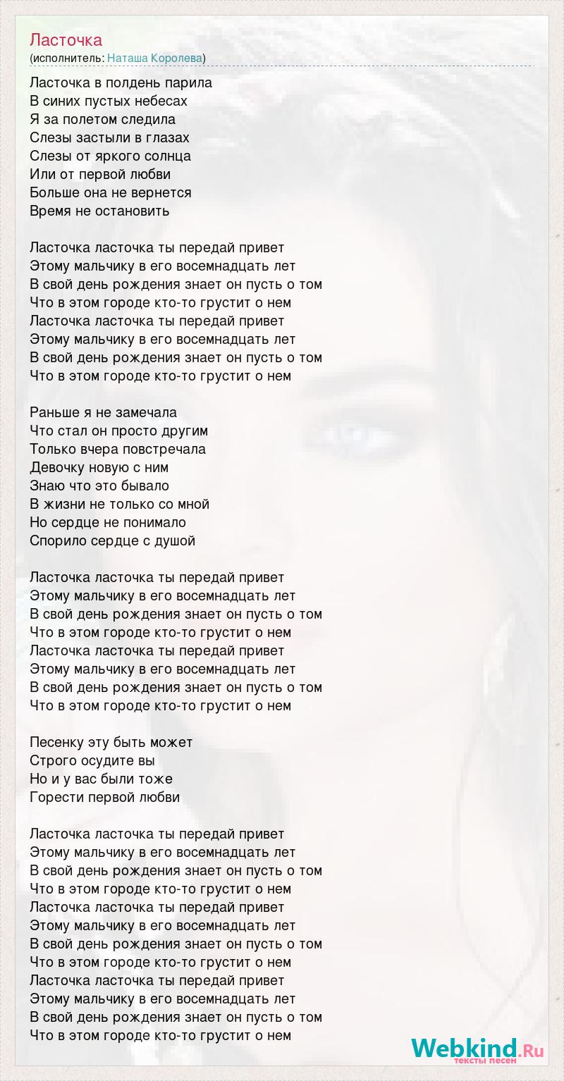 Ласточка в полдень парила В синих пустых небесах Я за полетом следила Слезы застыли в глазах Слезы от яркого солнца Или от первой любви Больше она не вернется Время не остановить Ласточка ласточка ты передай привет Этому мальчику в его восемнадцать лет В свой день рождения знает он пусть о том Что в этом городе кто-то грустит о нем Ласточка ласточка ты передай привет Этому мальчику в его восемнадцать лет В свой день рождения знает он пусть о том Что в этом городе кто-то грустит о нем Раньше я не замечала Что стал он просто другим Только вчера повстречала Девочку новую с ним Знаю что это бывало В жизни не только со мной Но сердце не понимало Спорило сердце с душой Ласточка ласточка ты передай привет Этому мальчику в его восемнадцать лет В свой день рождения знает он пусть о том Что в этом городе кто-то грустит о нем Ласточка ласточка ты передай привет Этому мальчику в его восемнадцать лет В свой день рождения знает он пусть о том Что в этом городе кто-то грустит о нем Песенку эту быть может Строго осудите вы Но и у вас были тоже Горести первой любви Ласточка ласточка ты передай привет Этому мальчику в его восемнадцать лет В свой день рождения знает он пусть о том Что в этом городе кто-то грустит о нем Ласточка ласточка ты передай привет Этому мальчику в его восемнадцать лет В свой день рождения знает он пусть о том Что в этом городе кто-то грустит о нем Ласточка ласточка ты передай привет Этому мальчику в его восемнадцать лет В свой день рождения знает он пусть о том Что в этом городе кто-то грустит о нем
