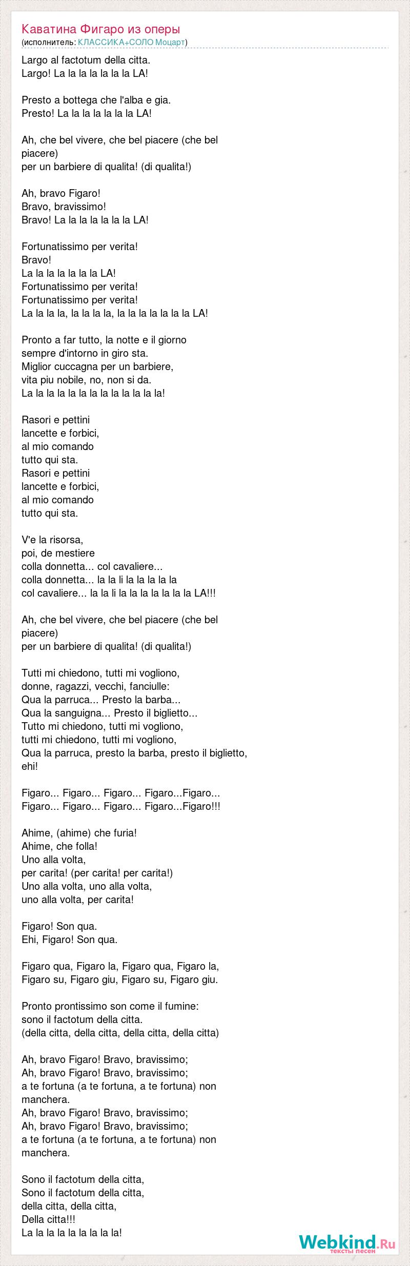 Largo al factotum della citta. Largo! La la la la la la la LA! Presto a bottega che l'alba e gia. Presto! La la la la la la la LA! Ah, che bel vivere, che bel piacere (che bel piacere) per un barbiere di qualita! (di qualita!) Ah, bravo Figaro! Bravo, bravissimo! Bravo! La la la la la la la LA! Fortunatissimo per verita! Bravo! La la la la la la la LA! Fortunatissimo per verita! Fortunatissimo per verita! La la la la, la la la la, la la la la la la la LA! Pronto a far tutto, la notte e il giorno sempre d'intorno in giro sta. Miglior cuccagna per un barbiere, vita piu nobile, no, non si da. La la la la la la la la la la la la la! Rasori e pettini lancette e forbici, al mio comando tutto qui sta. Rasori e pettini lancette e forbici, al mio comando tutto qui sta. V'e la risorsa, poi, de mestiere colla donnetta... col cavaliere... colla donnetta... la la li la la la la la col cavaliere... la la li la la la la la la la LA!!! Ah, che bel vivere, che bel piacere (che bel piacere) per un barbiere di qualita! (di qualita!) Tutti mi chiedono, tutti mi vogliono, donne, ragazzi, vecchi, fanciulle: Qua la parruca... Presto la barba... Qua la sanguigna... Presto il biglietto... Tutto mi chiedono, tutti mi vogliono, tutti mi chiedono, tutti mi vogliono, Qua la parruca, presto la barba, presto il biglietto, ehi! Figaro... Figaro... Figaro... Figaro...Figaro... Figaro... Figaro... Figaro... Figaro...Figaro!!! Ahime, (ahime) che furia! Ahime, che folla! Uno alla volta, per carita! (per carita! per carita!) Uno alla volta, uno alla volta, uno alla volta, per carita! Figaro! Son qua. Ehi, Figaro! Son qua. Figaro qua, Figaro la, Figaro qua, Figaro la, Figaro su, Figaro giu, Figaro su, Figaro giu. Pronto prontissimo son come il fumine: sono il factotum della citta. (della citta, della citta, della citta, della citta) Ah, bravo Figaro! Bravo, bravissimo; Ah, bravo Figaro! Bravo, bravissimo; a te fortuna (a te fortuna, a te fortuna) non manchera. Ah, bravo Figaro! Bravo, bravissimo; Ah, bravo Figaro! Bravo, bravissimo; a te fortuna (a te fortuna, a te fortuna) non manchera. Sono il factotum della citta, Sono il factotum della citta, della citta, della citta, Della citta!!! La la la la la la la la la!