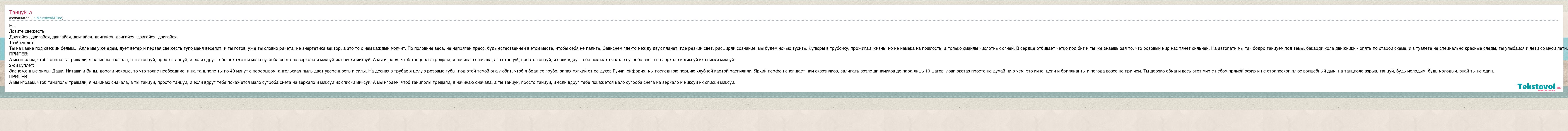 Е... Ловите свежесть. Двигайся, двигайся, двигайся, двигайся, двигайся, двигайся, двигайся, двигайся. 1-ый куплет: Ты на каене под свежим белым... Алле мы уже едем, дует ветер и первая свежесть тупо меня веселит, и ты готов, уже ты словно ракета, не энергетика вектор, а это то о чем каждый молчит. По половине веса, не напрягай пресс, будь естественней в этом месте, чтобы себя не палить. Зависнем где-то между двух планет, где резкий свет, расширяй сознание, мы будем ночью тусить. Купюры в трубочку, прожигай жизнь, но не намека на пошлость, а только смайлы кислотных огней. В сердце отбивает четко под бит и ты же знаешь зая то, что розовый мир нас тянет сильней. На автопати мы так бодро танцуем под темы, бакарди кола движники - опять по старой схеме, и в туалете не специально красные следы, ты улыбайся и лети со мной лети. ПРИПЕВ: А мы играем, чтоб танцполы трещали, я начинаю сначала, а ты танцуй, просто танцуй, и если вдруг тебе покажется мало сугроба снега на зеркало и миксуй их списки миксуй. А мы играем, чтоб танцполы трещали, я начинаю сначала, а ты танцуй, просто танцуй, и если вдруг тебе покажется мало сугроба снега на зеркало и миксуй их списки миксуй. 2-ой куплет: Заснеженные зимы, Даши, Наташи и Зины, дороги мокрые, то что толпе необходимо, и на танцполе ты по 40 минут с перерывом, ангельская пыль дает уверенность и силы. На деснах в трубах я целую розовые губы, под этой темой она любит, чтоб я брал ее грубо, запах мягкий от ее духов Гуччи, эйфория, мы последнюю порцию клубной картой распилили. Яркий перфон снег дает нам сквозняков, залипать возле динамиков до пара лишь 10 шагов, лови экстаз просто не думай ни о чем, это кино, цепи и бриллианты и погода вовсе не при чем. Ты дерзко обмани весь этот мир с небом прямой эфир и не страпоскоп плюс волшебный дым, на танцполе взрыв, танцуй, будь молодым, будь молодым, знай ты не один. ПРИПЕВ: А мы играем, чтоб танцполы трещали, я начинаю сначала, а ты танцуй, просто танцуй, и если вдруг тебе покажется мало сугроба снега на зеркало и миксуй их списки миксуй. А мы играем, чтоб танцполы трещали, я начинаю сначала, а ты танцуй, просто танцуй, и если вдруг тебе покажется мало сугроба снега на зеркало и миксуй их списки миксуй.