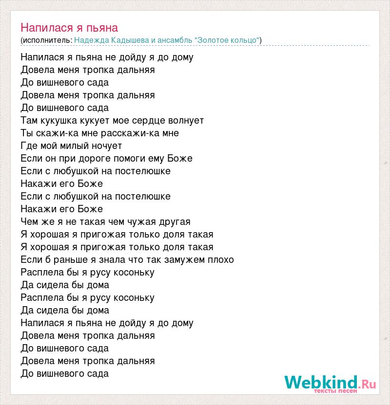 Напилася я пьяна не дойду я до дому Довела меня тропка дальняя До вишневого сада Довела меня тропка дальняя До вишневого сада Там кукушка кукует мое сердце волнует Ты скажи-ка мне расскажи-ка мне Где мой милый ночует Если он при дороге помоги ему Боже Если с любушкой на постелюшке Накажи его Боже Если с любушкой на постелюшке Накажи его Боже Чем же я не такая чем чужая другая Я хорошая я пригожая только доля такая Я хорошая я пригожая только доля такая Если б раньше я знала что так замужем плохо Расплела бы я русу косоньку Да сидела бы дома Расплела бы я русу косоньку Да сидела бы дома Напилася я пьяна не дойду я до дому Довела меня тропка дальняя До вишневого сада Довела меня тропка дальняя До вишневого сада