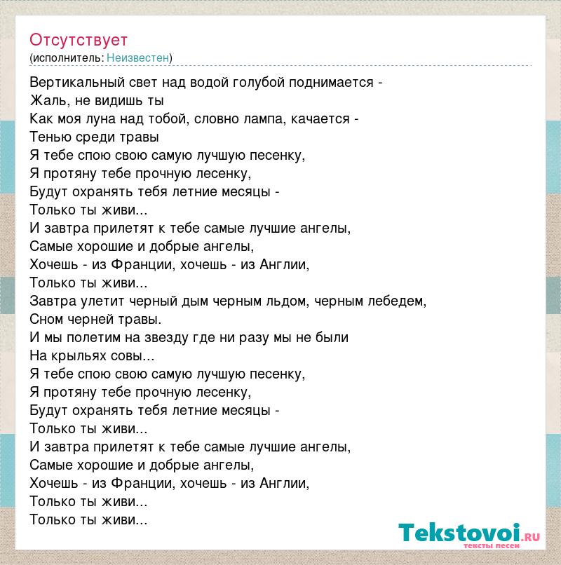 Вертикальный свет над водой голубой поднимается - Жаль, не видишь ты Как моя луна над тобой, словно лампа, качается - Тенью среди травы Я тебе спою свою самую лучшую песенку, Я протяну тебе прочную лесенку, Будут охранять тебя летние месяцы - Только ты живи... И завтра прилетят к тебе самые лучшие ангелы, Самые хорошие и добрые ангелы, Хочешь - из Франции, хочешь - из Англии, Только ты живи... Завтра улетит черный дым черным льдом, черным лебедем, Сном черней травы. И мы полетим на звезду где ни разу мы не были На крыльях совы... Я тебе спою свою самую лучшую песенку, Я протяну тебе прочную лесенку, Будут охранять тебя летние месяцы - Только ты живи... И завтра прилетят к тебе самые лучшие ангелы, Самые хорошие и добрые ангелы, Хочешь - из Франции, хочешь - из Англии, Только ты живи... Только ты живи...