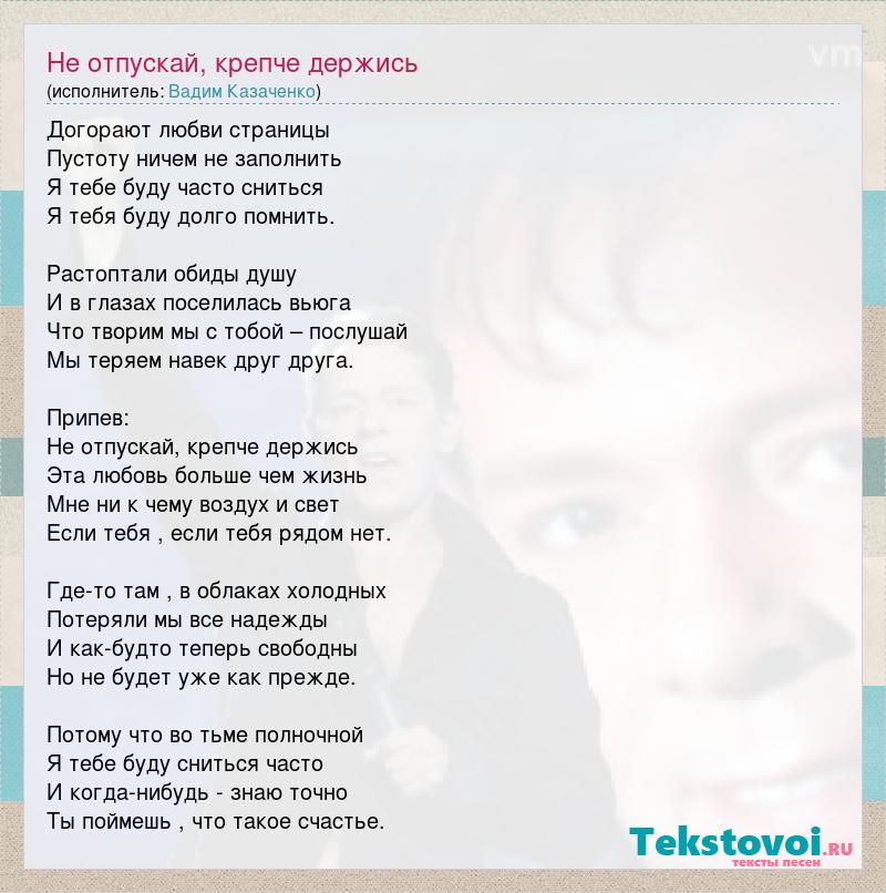 Догорают любви страницы Пустоту ничем не заполнить Я тебе буду часто сниться Я тебя буду долго помнить. Растоптали обиды душу И в глазах поселилась вьюга Что творим мы с тобой – послушай Мы теряем навек друг друга. Припев: Не отпускай, крепче держись Эта любовь больше чем жизнь Мне ни к чему воздух и свет Если тебя , если тебя рядом нет. Где-то там , в облаках холодных Потеряли мы все надежды И как-будто теперь свободны Но не будет уже как прежде. Потому что во тьме полночной Я тебе буду сниться часто И когда-нибудь - знаю точно Ты поймешь , что такое счастье.