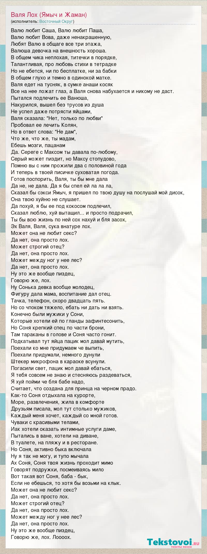 Валю любит Саша, Валю любит Паша, Валю любит Вова, даже ненакрашенную, Любят Валю в общаге все три этажа, Валюша девочка на внешность хороша. В общем чика неплохая, титечки в порядке, Талантливая, про любовь стихи в тетрадке Но не ебется, ни по бесплатке, ни за бабки В общем глухо и темно в одинокой матке. Валя едет на тусняк, в сумке анаши косяк Все на нее ложат глаз, а Валя снова набухается и никому не даст. Пытался подлечить ее Ванюша, Накурился, вышел без трусов из душа Не успел даже потрясти яйцами, Валя сказала: "Нет, только по любви" Пробовал ее лечить Колян, Но в ответ слова: "Не дам", Что же, что же, ты мадам, Ебешь мозги, пацанам Да. Сереге с Максом ты давала по-любому, Серый может пиздит, но Максу стопудово, Помню вы с ним прожили два с половиной года И теперь в твоей писичке суховатая погода. Готов поспорить, Валя, ты бы мне дала Да не, не дала. Да я бы спел ей ла ла ла, Сказал бы сэкси Ямыч, я пришел по твою душу на послушай мой дисок, Она твою хуйню не слушает. Да похуй, я бы ее под кокосом подлечил, Сказал люблю, хуй вытащил... и просто подрачил, Ты бы всю жизнь по ней сох нахуй и бля засох, Эх Валя, Валя, сука внатуре лох. Может она не любит секс? Да нет, она просто лох. Может строгий отец? Да нет, она просто лох. Может между ног у нее лес? Да нет, она просто лох. Ну это же вообще пиздец, Говорю же, лох. Ну Сонька девка вообще молодец, Фигуру дала мама, воспитание дал отец. Тачка, телефон, скоро двадцать пять. Но со чпоком тяжело, ебать ни дать ни взять. Конечно были мужики у Сони, Которые хотели ей по гланды зафинтесонить, Но Соня крепкий спец по части брони, Там тараканы в голове и Соня часто гонит. Подкатывал тут яйца пацик мол давай мутить, Поехали ко мне придумаем че выпить, Поехали придумали, немного дунули Штекер микрофона в караоке всунули. Погасили свет, пацик мол давай ебаться, Я тебя совсем не знаю и стесняюсь раздеваться, Я хуй пойми че бля бабе надо, Считает, что создана для принца на черном прадо. Как-то Соня отдыхала на курорте, Море, развлечения, жила в комфорте Друзьям писала, мол тут столько мужиков, Каждый меня хочет, каждый со мной готов. Чуваки с красивыми телами, Иак хотели оказать интимные услуги даме, Пытались в ване, хотели на диване, В туалете, на пляжу и в ресторане. Но Соня, активно быка включала Ну я так не могу, и тупо мычала Ах Соня, Соня твоя жизнь проходит мимо Говорят подружки, посмеиваясь мило Вот такая вот Соня, баба - бык, Если не ебешься, то хотя бы возьми на клык. Может она не любит секс? Да нет, она просто лох. Может строгий отец? Да нет, она просто лох. Может между ног у нее лес? Да нет, она просто лох. Ну это же вообще пиздец, Говорю же, лох. Лоооох.