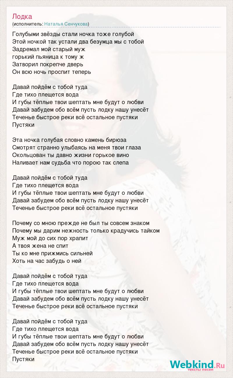 Голубыми звёзды стали ночка тоже голубой Этой ночкой так устали два безумца мы с тобой Задремал мой старый муж горький пьяница к тому ж Затворил покрепче дверь Он всю ночь проспит теперь Давай пойдём с тобой туда Где тихо плещется вода И губы тёплые твои шептать мне будут о любви Давай забудем обо всём пусть лодку нашу унесёт Теченье быстрое реки всё остальное пустяки Пустяки Эта ночка голубая словно камень бирюза Смотрят странно улыбаясь на меня твои глаза Окольцован ты давно жизни горькое вино Наливает нам судьба что порою так слепа Давай пойдём с тобой туда Где тихо плещется вода И губы тёплые твои шептать мне будут о любви Давай забудем обо всём пусть лодку нашу унесёт Теченье быстрое реки всё остальное пустяки Почему со мною прежде не был ты совсем знаком Почему мы дарим нежность только крадучись тайком Муж мой до сих пор храпит А твоя жена не спит Ты ко мне прижмись сильней Хоть на час забудь о ней Давай пойдём с тобой туда Где тихо плещется вода И губы тёплые твои шептать мне будут о любви Давай забудем обо всём пусть лодку нашу унесёт Теченье быстрое реки всё остальное пустяки Давай пойдём с тобой туда Где тихо плещется вода И губы тёплые твои шептать мне будут о любви Давай забудем обо всём пусть лодку нашу унесёт Теченье быстрое реки всё остальное пустяки Пустяки
