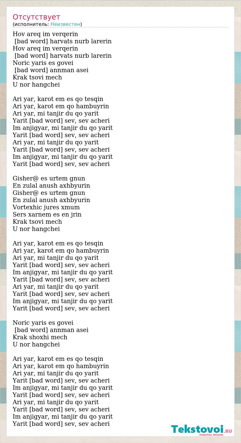 Hov areq im verqerin Siruc harvats nurb larerin Hov areq im verqerin Siruc harvats nurb larerin Noric yaris es govei Sirun annman asei Krak tsovi mech U nor hangchei Ari yar, karot em es qo tesqin Ari yar, karot em qo hambuyrin Ari yar, mi tanjir du qo yarit Yarit sirun sev, sev acheri Im anjigyar, mi tanjir du qo yarit Yarit sirun sev, sev acheri Ari yar, mi tanjir du qo yarit Yarit sirun sev, sev acheri Im anjigyar, mi tanjir du qo yarit Yarit sirun sev, sev acheri Gisher@ es urtem gnun En zulal anush axhbyurin Gisher@ es urtem gnun En zulal anush axhbyurin Vortexhic jures xmum Sers xarnem es en jrin Krak tsovi mech U nor hangchei Ari yar, karot em es qo tesqin Ari yar, karot em qo hambuyrin Ari yar, mi tanjir du qo yarit Yarit sirun sev, sev acheri Im anjigyar, mi tanjir du qo yarit Yarit sirun sev, sev acheri Ari yar, mi tanjir du qo yarit Yarit sirun sev, sev acheri Im anjigyar, mi tanjir du qo yarit Yarit sirun sev, sev acheri Noric yaris es govei Sirun annman asei Krak shoxhi mech U nor hangchei Ari yar, karot em es qo tesqin Ari yar, karot em qo hambuyrin Ari yar, mi tanjir du qo yarit Yarit sirun sev, sev acheri Im anjigyar, mi tanjir du qo yarit Yarit sirun sev, sev acheri Ari yar, mi tanjir du qo yarit Yarit sirun sev, sev acheri Im anjigyar, mi tanjir du qo yarit Yarit sirun sev, sev acheri