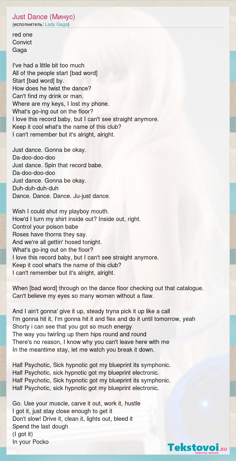 red one Convict Gaga I've had a little bit too much All of the people start [bad word] Start [bad word] by. How does he twist the dance? Can't find my drink or man. Where are my keys, I lost my phone. What's go-ing out on the floor? I love this record baby, but I can't see straight anymore. Keep it cool what's the name of this club? I can't remember but it's alright, alright. Just dance. Gonna be okay. Da-doo-doo-doo Just dance. Spin that record babe. Da-doo-doo-doo Just dance. Gonna be okay. Duh-duh-duh-duh Dance. Dance. Dance. Ju-just dance. Wish I could shut my playboy mouth. How'd I turn my shirt inside out? Inside out, right. Control your poison babe Roses have thorns they say. And we're all gettin' hosed tonight. What's go-ing out on the floor? I love this record baby, but I can't see straight anymore. Keep it cool what's the name of this club? I can't remember but it's alright, alright. When [bad word] through on the dance floor checking out that catalogue. Can't believe my eyes so many women without a flaw. And I ain't gonna' give it up, steady tryna pick it up like a call I'm gonna hit it, I'm gonna hit it and flex and do it until tomorrow, yeah Shorty i can see that you got so much energy The way you twirling up them hips round and round There's no reason, I know why you can't leave here with me In the meantime stay, let me watch you break it down. Half Psychotic, Sick hypnotic got my blueprint its symphonic. Half Psychotic, sick hypnotic got my blueprint electronic. Half Psychotic, Sick hypnotic got my blueprint its symphonic. Half Psychotic, sick hypnotic got my blueprint electronic. Go. Use your muscle, carve it out, work it, hustle I got it, just stay close enough to get it Don't slow! Drive it, clean it, lights out, bleed it Spend the last dough (I got it) In your Pocko