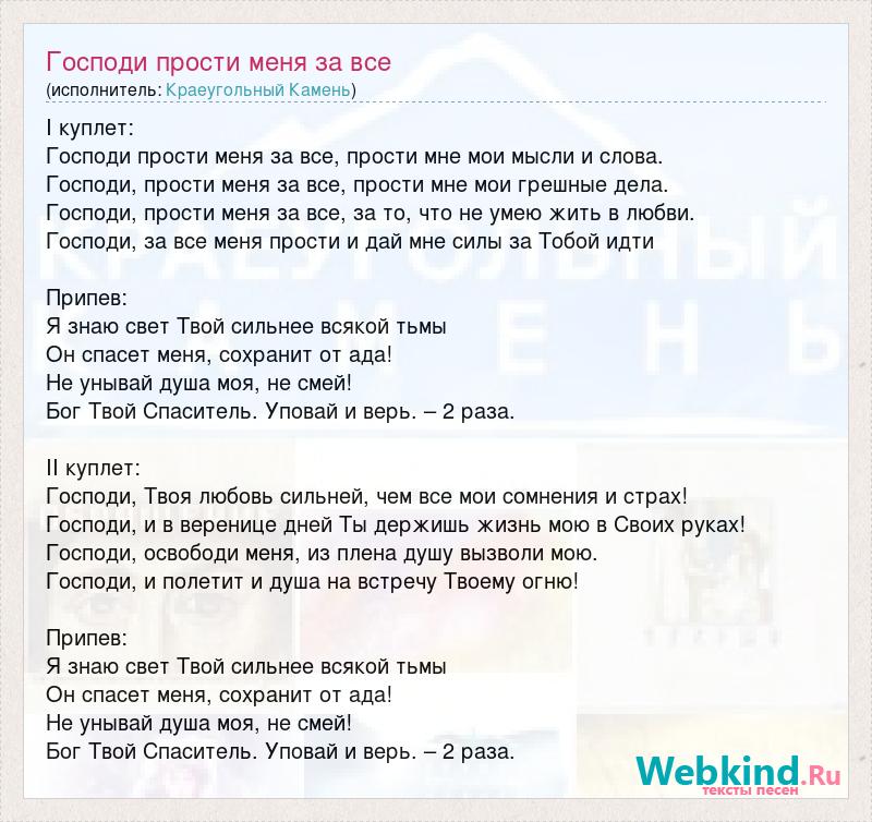 I куплет: Господи прости меня за все, прости мне мои мысли и слова. Господи, прости меня за все, прости мне мои грешные дела. Господи, прости меня за все, за то, что не умею жить в любви. Господи, за все меня прости и дай мне силы за Тобой идти Припев: Я знаю свет Твой сильнее всякой тьмы Он спасет меня, сохранит от ада! Не унывай душа моя, не смей! Бог Твой Спаситель. Уповай и верь. – 2 раза. II куплет: Господи, Твоя любовь сильней, чем все мои сомнения и страх! Господи, и в веренице дней Ты держишь жизнь мою в Своих руках! Господи, освободи меня, из плена душу вызволи мою. Господи, и полетит и душа на встречу Твоему огню! Припев: Я знаю свет Твой сильнее всякой тьмы Он спасет меня, сохранит от ада! Не унывай душа моя, не смей! Бог Твой Спаситель. Уповай и верь. – 2 раза.