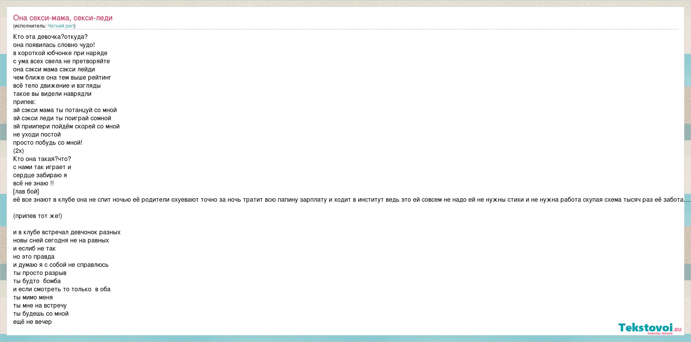 Кто эта девочка?откуда? она появилась словно чудо! в короткой юбчонке при наряде с ума всех свела не претворяйте она сэкси мама сэкси лейди чем ближе она тем выше рейтинг всё тело движение и взгляды такое вы видели наврядли припев: эй сэкси мама ты потанцуй со мной эй сэкси леди ты поиграй сомной эй приипери пойдём скорей со мной не уходи постой просто побудь со мной! (2х) Кто она такая?что? с нами так играет и сердце забираю я всё не знаю !! [лав бой] её все знают в клубе она не спит ночью её родители охуевают точно за ночь тратит всю папину зарплату и ходит в институт ведь это ей совсем не надо ей не нужны стихи и не нужна работа скупая схема тысяч раз её забота.... (припев тот же!) и в клубе встречал девчонок разных новы сней сегодня не на равных и еслиб не так но это правда и думаю я с собой не справлюсь ты просто разрыв ты будто бомба и если смотреть то только в оба ты мимо меня ты мне на встречу ты будешь со мной ещё не вечер