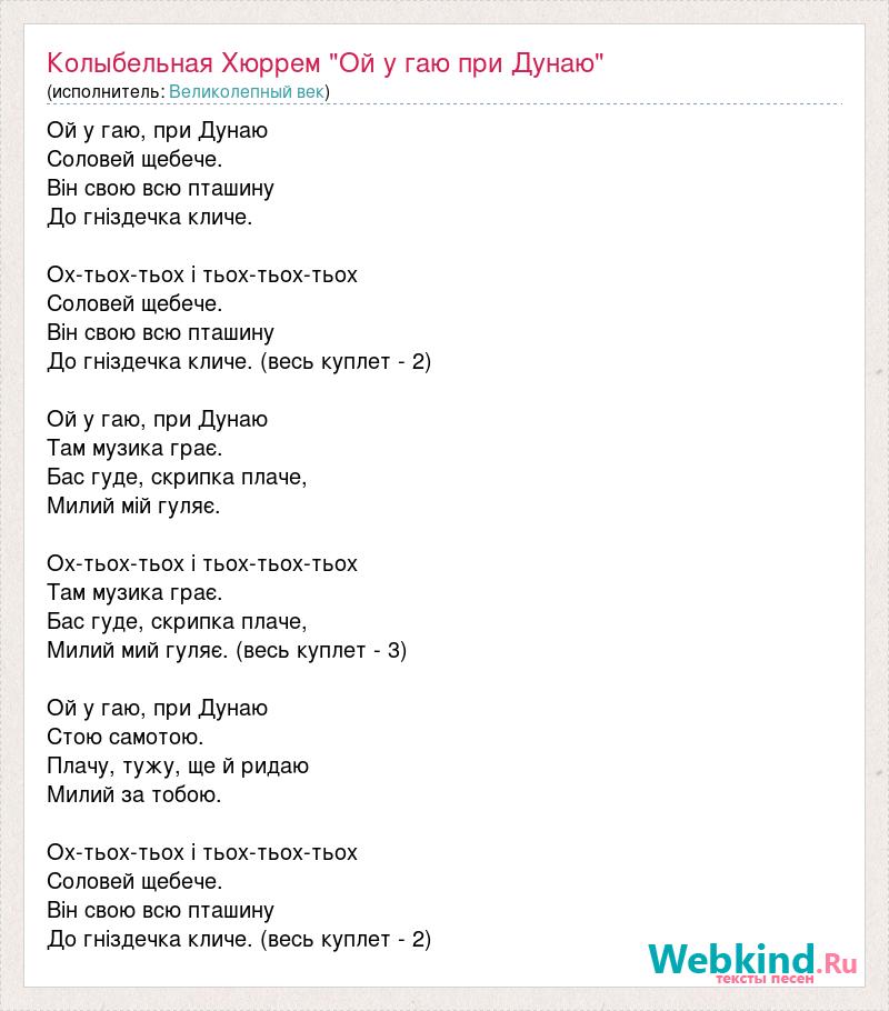 Ой у гаю, при Дунаю Соловей щебече. Він свою всю пташину До гніздечка кличе. Ох-тьох-тьох і тьох-тьох-тьох Соловей щебече. Він свою всю пташину До гніздечка кличе. (весь куплет - 2) Ой у гаю, при Дунаю Там музика грає. Бас гуде, скрипка плаче, Милий мій гуляє. Ох-тьох-тьох і тьох-тьох-тьох Там музика грає. Бас гуде, скрипка плаче, Милий мий гуляє. (весь куплет - 3) Ой у гаю, при Дунаю Стою самотою. Плачу, тужу, ще й ридаю Милий за тобою. Ох-тьох-тьох і тьох-тьох-тьох Соловей щебече. Він свою всю пташину До гніздечка кличе. (весь куплет - 2)