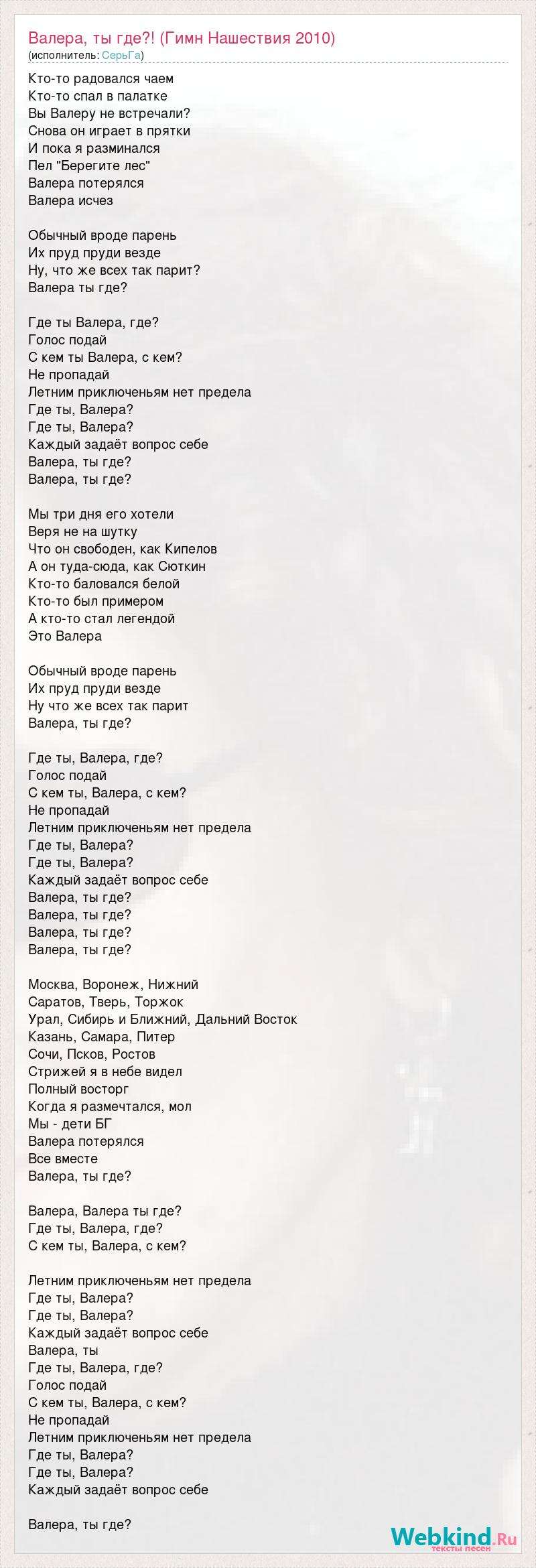 Кто-то радовался чаем Кто-то спал в палатке Вы Валеру не встречали? Снова он играет в прятки И пока я разминался Пел "Берегите лес" Валера потерялся Валера исчез Обычный вроде парень Их пруд пруди везде Ну, что же всех так парит? Валера ты где? Где ты Валера, где? Голос подай С кем ты Валера, с кем? Не пропадай Летним приключеньям нет предела Где ты, Валера? Где ты, Валера? Каждый задаёт вопрос себе Валера, ты где? Валера, ты где? Мы три дня его хотели Веря не на шутку Что он свободен, как Кипелов А он туда-сюда, как Сюткин Кто-то баловался белой Кто-то был примером А кто-то стал легендой Это Валера Обычный вроде парень Их пруд пруди везде Ну что же всех так парит Валера, ты где? Где ты, Валера, где? Голос подай С кем ты, Валера, с кем? Не пропадай Летним приключеньям нет предела Где ты, Валера? Где ты, Валера? Каждый задаёт вопрос себе Валера, ты где? Валера, ты где? Валера, ты где? Валера, ты где? Москва, Воронеж, Нижний Саратов, Тверь, Торжок Урал, Сибирь и Ближний, Дальний Восток Казань, Самара, Питер Сочи, Псков, Ростов Стрижей я в небе видел Полный восторг Когда я размечтался, мол Мы - дети БГ Валера потерялся Все вместе Валера, ты где? Валера, Валера ты где? Где ты, Валера, где? С кем ты, Валера, с кем? Летним приключеньям нет предела Где ты, Валера? Где ты, Валера? Каждый задаёт вопрос себе Валера, ты Где ты, Валера, где? Голос подай С кем ты, Валера, с кем? Не пропадай Летним приключеньям нет предела Где ты, Валера? Где ты, Валера? Каждый задаёт вопрос себе Валера, ты где?