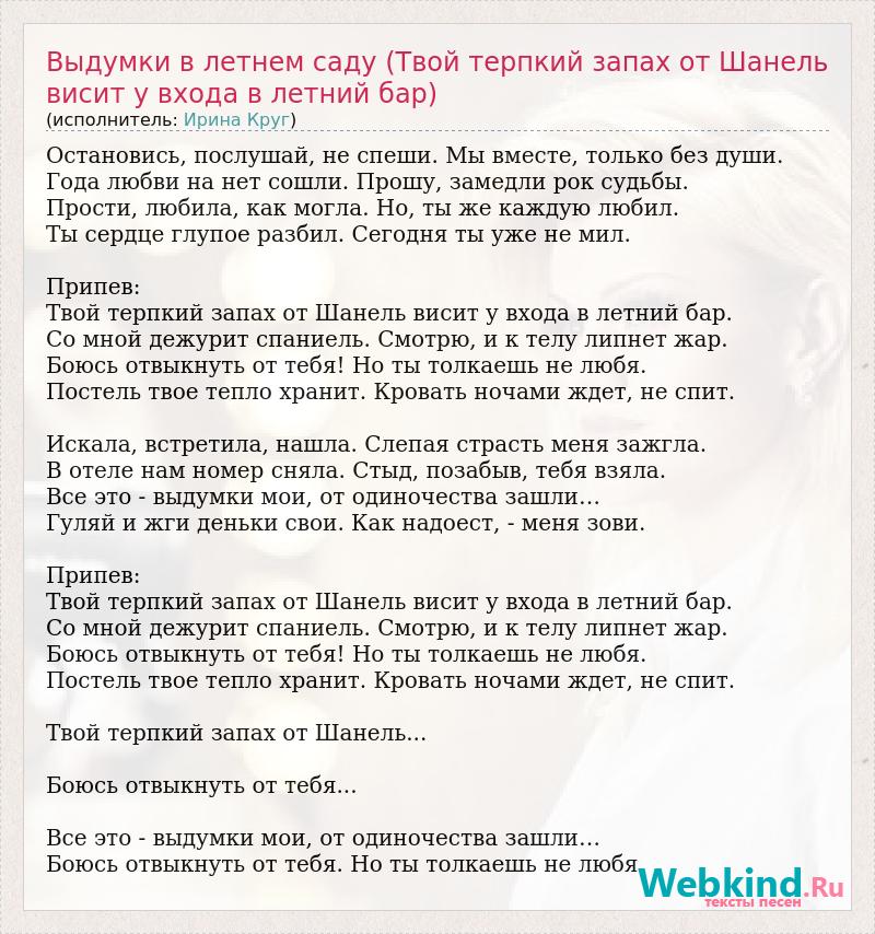 Остановись, послушай, не спеши. Мы вместе, только без души. Года любви на нет сошли. Прошу, замедли рок судьбы. Прости, любила, как могла. Но, ты же каждую любил. Ты сердце глупое разбил. Сегодня ты уже не мил. Припев: Твой терпкий запах от Шанель висит у входа в летний бар. Со мной дежурит спаниель. Смотрю, и к телу липнет жар. Боюсь отвыкнуть от тебя! Но ты толкаешь не любя. Постель твое тепло хранит. Кровать ночами ждет, не спит. Искала, встретила, нашла. Слепая страсть меня зажгла. В отеле нам номер сняла. Стыд, позабыв, тебя взяла. Все это - выдумки мои, от одиночества зашли… Гуляй и жги деньки свои. Как надоест, - меня зови. Припев: Твой терпкий запах от Шанель висит у входа в летний бар. Со мной дежурит спаниель. Смотрю, и к телу липнет жар. Боюсь отвыкнуть от тебя! Но ты толкаешь не любя. Постель твое тепло хранит. Кровать ночами ждет, не спит. Твой терпкий запах от Шанель... Боюсь отвыкнуть от тебя... Все это - выдумки мои, от одиночества зашли… Боюсь отвыкнуть от тебя. Но ты толкаешь не любя.