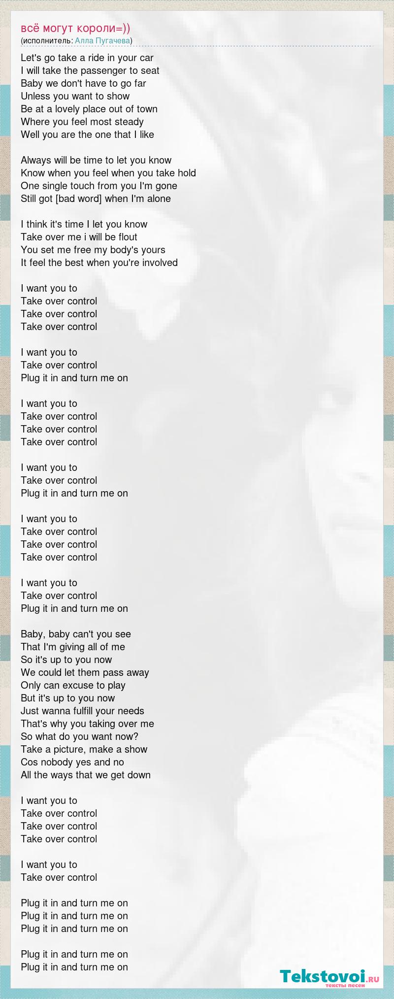 Let's go take a ride in your car I will take the passenger to seat Baby we don't have to go far Unless you want to show Be at a lovely place out of town Where you feel most steady Well you are the one that I like Always will be time to let you know Know when you feel when you take hold One single touch from you I'm gone Still got the rush when I'm alone I think it's time I let you know Take over me i will be flout You set me free my body's yours It feel the best when you're involved I want you to Take over control Take over control Take over control I want you to Take over control Plug it in and turn me on I want you to Take over control Take over control Take over control I want you to Take over control Plug it in and turn me on I want you to Take over control Take over control Take over control I want you to Take over control Plug it in and turn me on Baby, baby can't you see That I'm giving all of me So it's up to you now We could let them pass away Only can excuse to play But it's up to you now Just wanna fulfill your needs That's why you taking over me So what do you want now? Take a picture, make a show Cos nobody yes and no All the ways that we get down I want you to Take over control Take over control Take over control I want you to Take over control Plug it in and turn me on Plug it in and turn me on Plug it in and turn me on Plug it in and turn me on Plug it in and turn me on