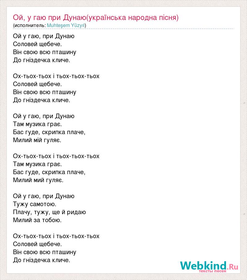 Ой у гаю, при Дунаю Соловей щебече. Він свою всю пташину До гніздечка кличе. Ох-тьох-тьох і тьох-тьох-тьох Соловей щебече. Він свою всю пташину До гніздечка кличе. Ой у гаю, при Дунаю Там музика грає. Бас гуде, скрипка плаче, Милий мій гуляє. Ох-тьох-тьох і тьох-тьох-тьох Там музика грає. Бас гуде, скрипка плаче, Милий мий гуляє. Ой у гаю, при Дунаю Тужу самотою. Плачу, тужу, ще й ридаю Милий за тобою. Ох-тьох-тьох і тьох-тьох-тьох Соловей щебече. Він свою всю пташину До гніздечка кличе.