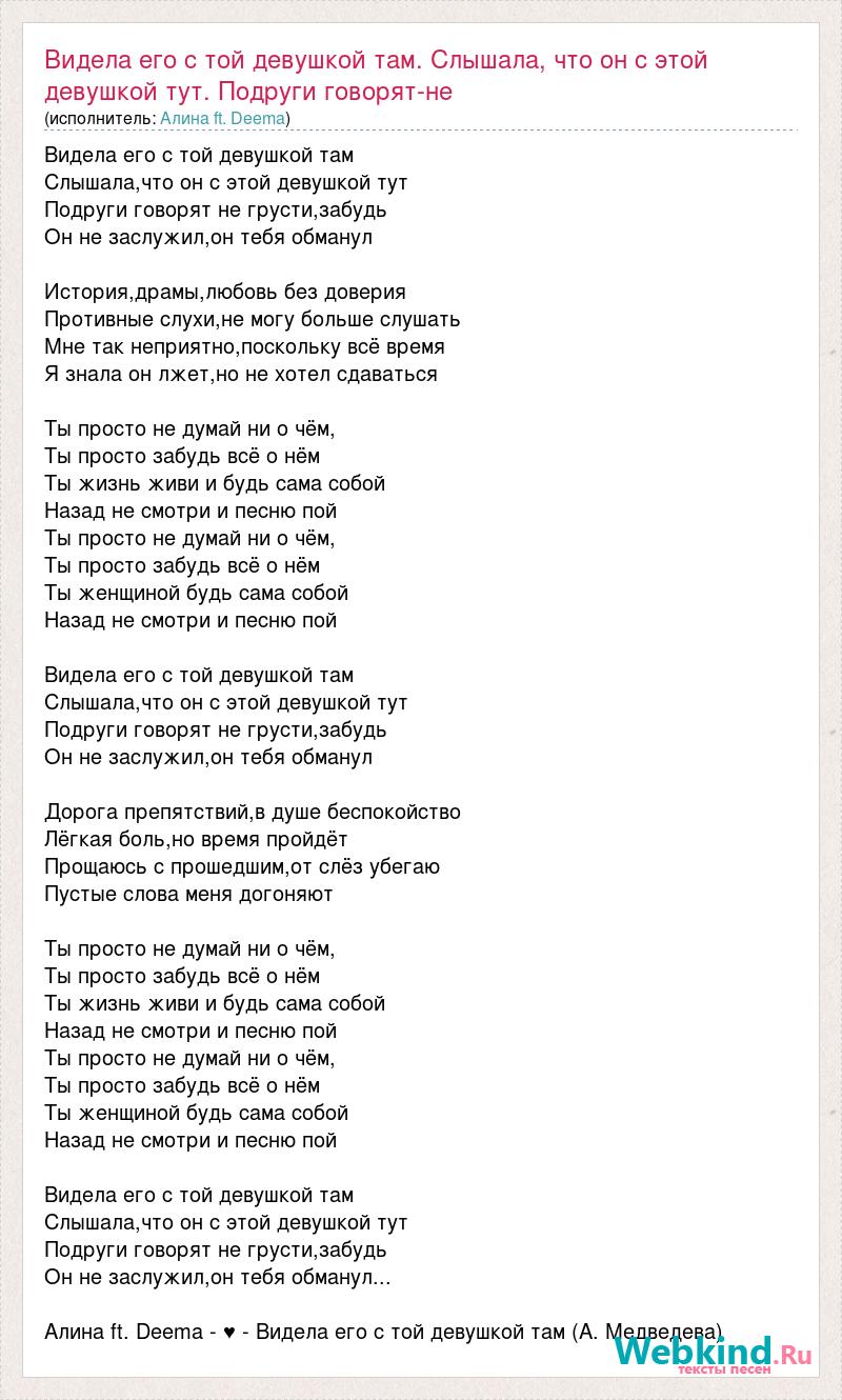 Видела его с той девушкой там Слышала,что он с этой девушкой тут Подруги говорят не грусти,забудь Он не заслужил,он тебя обманул История,драмы,любовь без доверия Противные слухи,не могу больше слушать Мне так неприятно,поскольку всё время Я знала он лжет,но не хотел сдаваться Ты просто не думай ни о чём, Ты просто забудь всё о нём Ты жизнь живи и будь сама собой Назад не смотри и песню пой Ты просто не думай ни о чём, Ты просто забудь всё о нём Ты женщиной будь сама собой Назад не смотри и песню пой Видела его с той девушкой там Слышала,что он с этой девушкой тут Подруги говорят не грусти,забудь Он не заслужил,он тебя обманул Дорога препятствий,в душе беспокойство Лёгкая боль,но время пройдёт Прощаюсь с прошедшим,от слёз убегаю Пустые слова меня догоняют Ты просто не думай ни о чём, Ты просто забудь всё о нём Ты жизнь живи и будь сама собой Назад не смотри и песню пой Ты просто не думай ни о чём, Ты просто забудь всё о нём Ты женщиной будь сама собой Назад не смотри и песню пой Видела его с той девушкой там Слышала,что он с этой девушкой тут Подруги говорят не грусти,забудь Он не заслужил,он тебя обманул... Алина ft. Deema - ♥ - Видела его с той девушкой там (А. Медведева)