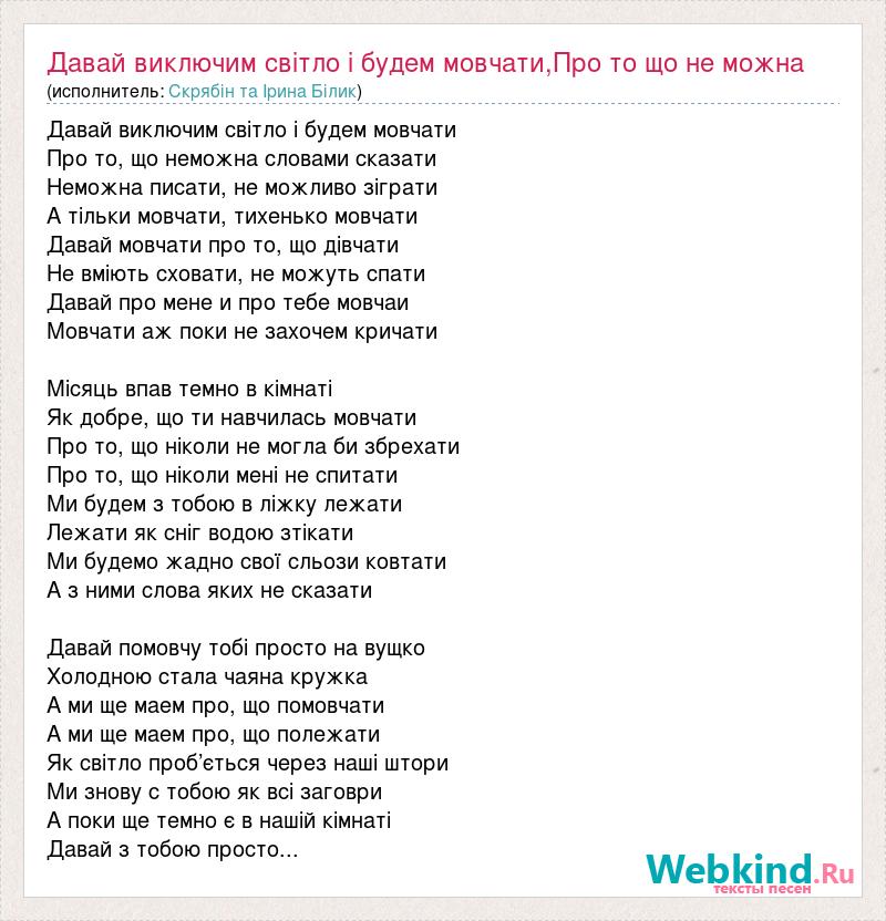 Давай виключим світло і будем мовчати Про то, що неможна словами сказати Неможна писати, не можливо зіграти А тільки мовчати, тихенько мовчати Давай мовчати про то, що дівчати Не вміють сховати, не можуть спати Давай про мене и про тебе мовчаи Мовчати аж поки не захочем кричати Місяць впав темно в кімнаті Як добре, що ти навчилась мовчати Про то, що ніколи не могла би збрехати Про то, що ніколи мені не спитати Ми будем з тобою в ліжку лежати Лежати як сніг водою зтікати Ми будемо жадно свої сльози ковтати А з ними слова яких не сказати Давай помовчу тобі просто на вущко Холодною стала чаяна кружка А ми ще маем про, що помовчати А ми ще маем про, що полежати Як світло проб’ється через наші штори Ми знову с тобою як всі заговри А поки ще темно є в нашій кімнаті Давай з тобою просто...