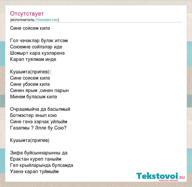 Сине соясем килэ Гол чэчэклэр булэк итсэм Союемне сойлэлэр иде Шомырт кара кузлэренэ Карап туялмам инде Кушымта(припев): Сине соясем килэ Сине убэсем килэ Синен ярым ,синен парын Минем буласым килэ Очрашмыйча да басылмый Ботмэстер янып кою Сине генэ хэрчак уйлыйм Газапмы ? Элле бу Сою? Кушымта(припев) Зифа буйсыннарынны да Ерактан куреп таныйм Гел крыйларында булсамда Узенэ карап туймыйм