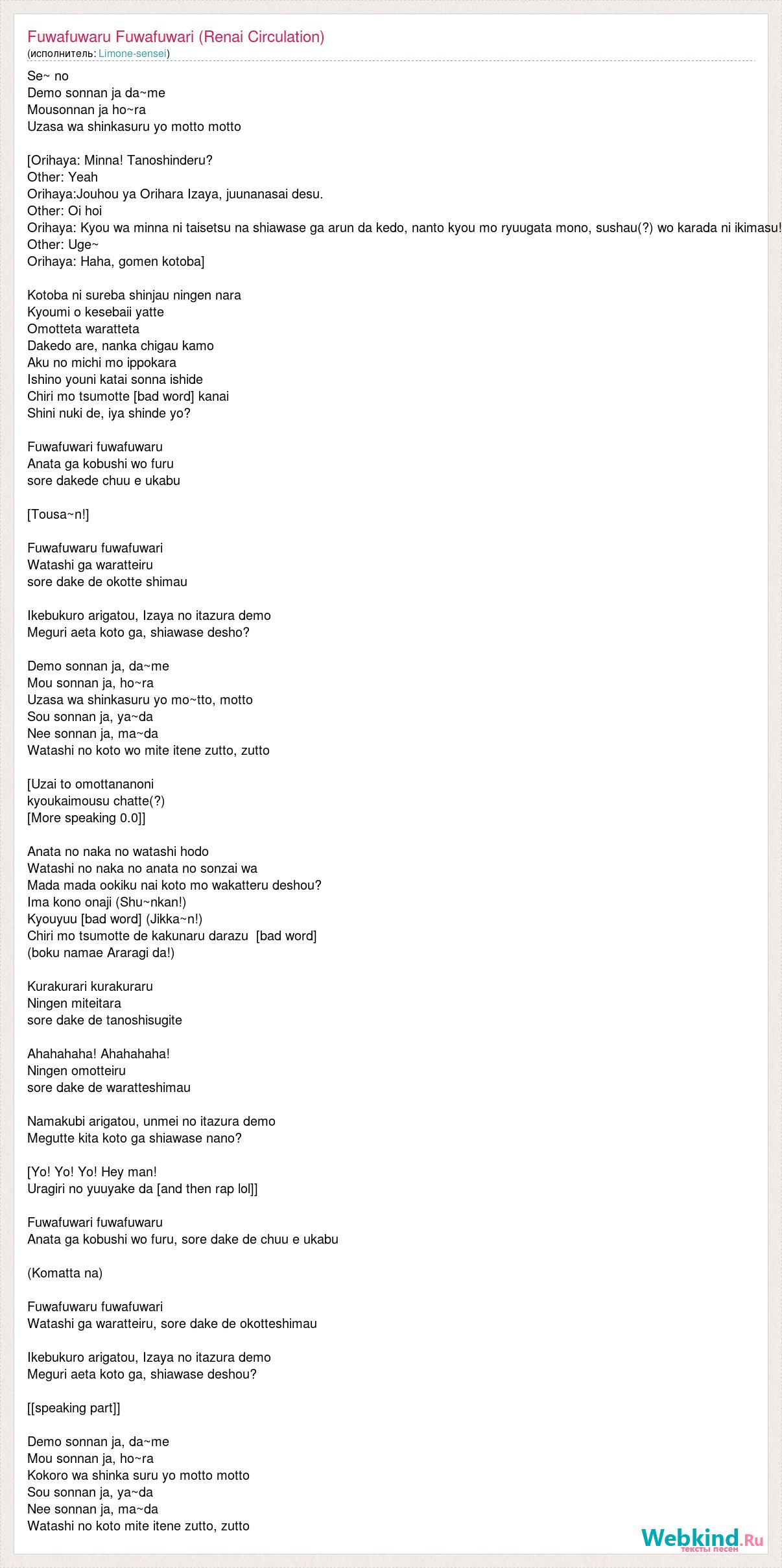 Se~ no Demo sonnan ja da~me Mousonnan ja ho~ra Uzasa wa shinkasuru yo motto motto [Orihaya: Minna! Tanoshinderu? Other: Yeah Orihaya:Jouhou ya Orihara Izaya, juunanasai desu. Other: Oi hoi Orihaya: Kyou wa minna ni taisetsu na shiawase ga arun da kedo, nanto kyou mo ryuugata mono, sushau(?) wo karada ni ikimasu! Other: Uge~ Orihaya: Haha, gomen kotoba] Kotoba ni sureba shinjau ningen nara Kyoumi o kesebaii yatte Omotteta waratteta Dakedo are, nanka chigau kamo Aku no michi mo ippokara Ishino youni katai sonna ishide Chiri mo tsumotte [bad word] kanai Shini nuki de, iya shinde yo? Fuwafuwari fuwafuwaru Anata ga kobushi wo furu sore dakede chuu e ukabu [Tousa~n!] Fuwafuwaru fuwafuwari Watashi ga waratteiru sore dake de okotte shimau Ikebukuro arigatou, Izaya no itazura demo Meguri aeta koto ga, shiawase desho? Demo sonnan ja, da~me Mou sonnan ja, ho~ra Uzasa wa shinkasuru yo mo~tto, motto Sou sonnan ja, ya~da Nee sonnan ja, ma~da Watashi no koto wo mite itene zutto, zutto [Uzai to omottananoni kyoukaimousu chatte(?) [More speaking 0.0]] Anata no naka no watashi hodo Watashi no naka no anata no sonzai wa Mada mada ookiku nai koto mo wakatteru deshou? Ima kono onaji (Shu~nkan!) Kyouyuu [bad word] (Jikka~n!) Chiri mo tsumotte de kakunaru darazu [bad word] (boku namae Araragi da!) Kurakurari kurakuraru Ningen miteitara sore dake de tanoshisugite Ahahahaha! Ahahahaha! Ningen omotteiru sore dake de waratteshimau Namakubi arigatou, unmei no itazura demo Megutte kita koto ga shiawase nano? [Yo! Yo! Yo! Hey man! Uragiri no yuuyake da [and then rap lol]] Fuwafuwari fuwafuwaru Anata ga kobushi wo furu, sore dake de chuu e ukabu (Komatta na) Fuwafuwaru fuwafuwari Watashi ga waratteiru, sore dake de okotteshimau Ikebukuro arigatou, Izaya no itazura demo Meguri aeta koto ga, shiawase deshou? [[speaking part]] Demo sonnan ja, da~me Mou sonnan ja, ho~ra Kokoro wa shinka suru yo motto motto Sou sonnan ja, ya~da Nee sonnan ja, ma~da Watashi no koto mite itene zutto, zutto