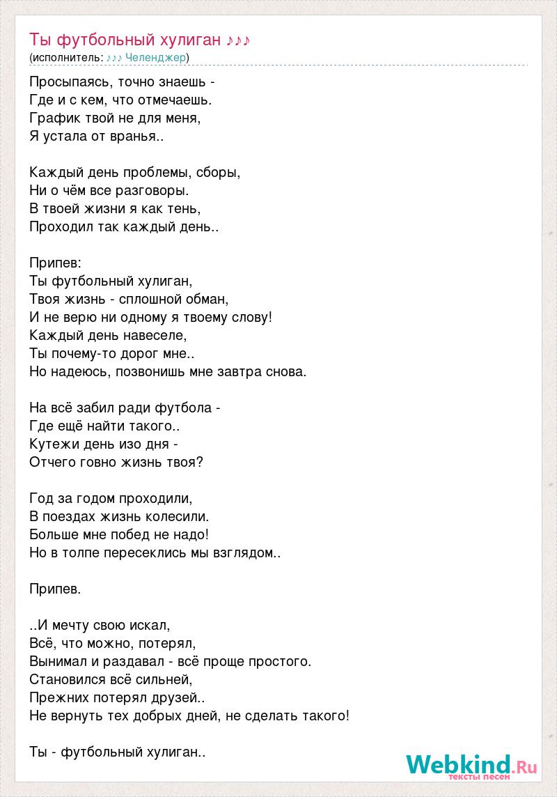 Просыпаясь, точно знаешь - Где и с кем, что отмечаешь. График твой не для меня, Я устала от вранья.. Каждый день проблемы, сборы, Ни о чём все разговоры. В твоей жизни я как тень, Проходил так каждый день.. Припев: Ты футбольный хулиган, Твоя жизнь - сплошной обман, И не верю ни одному я твоему слову! Каждый день навеселе, Ты почему-то дорог мне.. Но надеюсь, позвонишь мне завтра снова. На всё забил ради футбола - Где ещё найти такого.. Кутежи день изо дня - Отчего говно жизнь твоя? Год за годом проходили, В поездах жизнь колесили. Больше мне побед не надо! Но в толпе пересеклись мы взглядом.. Припев. ..И мечту свою искал, Всё, что можно, потерял, Вынимал и раздавал - всё проще простого. Становился всё сильней, Прежних потерял друзей.. Не вернуть тех добрых дней, не сделать такого! Ты - футбольный хулиган..