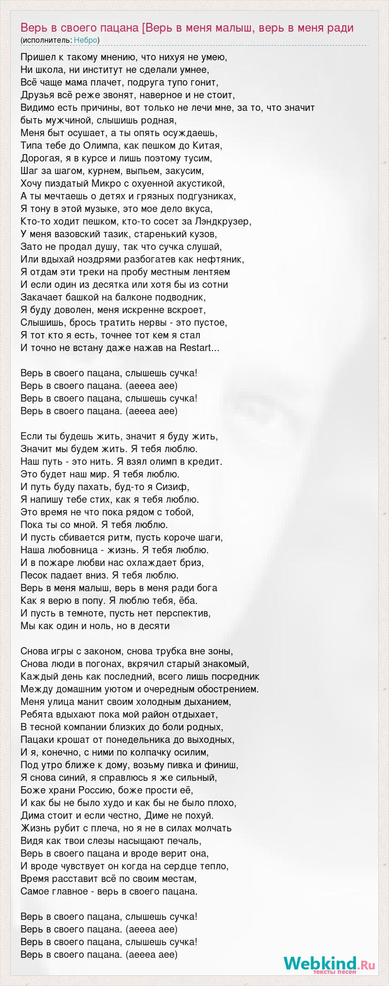 Пришел к такому мнению, что нихуя не умею, Ни школа, ни институт не сделали умнее, Всё чаще мама плачет, подруга тупо гонит, Друзья всё реже звонят, наверное и не стоит, Видимо есть причины, вот только не лечи мне, за то, что значит быть мужчиной, слышишь родная, Меня быт осушает, а ты опять осуждаешь, Типа тебе до Олимпа, как пешком до Китая, Дорогая, я в курсе и лишь поэтому тусим, Шаг за шагом, курнем, выпьем, закусим, Хочу пиздатый Микро с охуенной акустикой, А ты мечтаешь о детях и грязных подгузниках, Я тону в этой музыке, это мое дело вкуса, Кто-то ходит пешком, кто-то сосет за Лэндкрузер, У меня вазовский тазик, старенький кузов, Зато не продал душу, так что сучка слушай, Или вдыхай ноздрями разбогатев как нефтяник, Я отдам эти треки на пробу местным лентяем И если один из десятка или хотя бы из сотни Закачает башкой на балконе подводник, Я буду доволен, меня искренне вскроет, Слышишь, брось тратить нервы - это пустое, Я тот кто я есть, точнее тот кем я стал И точно не встану даже нажав на Restart... Верь в своего пацана, слышешь сучка! Верь в своего пацана. (аеееа аее) Верь в своего пацана, слышешь сучка! Верь в своего пацана. (аеееа аее) Если ты будешь жить, значит я буду жить, Значит мы будем жить. Я тебя люблю. Наш путь - это нить. Я взял олимп в кредит. Это будет наш мир. Я тебя люблю. И путь буду пахать, буд-то я Сизиф, Я напишу тебе стих, как я тебя люблю. Это время не что пока рядом с тобой, Пока ты со мной. Я тебя люблю. И пусть сбивается ритм, пусть короче шаги, Наша любовница - жизнь. Я тебя люблю. И в пожаре любви нас охлаждает бриз, Песок падает вниз. Я тебя люблю. Верь в меня малыш, верь в меня ради бога Как я верю в попу. Я люблю тебя, ёба. И пусть в темноте, пусть нет перспектив, Мы как один и ноль, но в десяти Снова игры с законом, снова трубка вне зоны, Снова люди в погонах, вкрячил старый знакомый, Каждый день как последний, всего лишь посредник Между домашним уютом и очередным обострением. Меня улица манит своим холодным дыханием, Ребята вдыхают пока мой район отдыхает, В тесной компании близких до боли родных, Пацаки крошат от понедельника до выходных, И я, конечно, с ними по колпачку осилим, Под утро ближе к дому, возьму пивка и финиш, Я снова синий, я справлюсь я же сильный, Боже храни Россию, боже прости её, И как бы не было худо и как бы не было плохо, Дима стоит и если честно, Диме не похуй. Жизнь рубит с плеча, но я не в силах молчать Видя как твои слезы насыщают печаль, Верь в своего пацана и вроде верит она, И вроде чувствует он когда на сердце тепло, Время расставит всё по своим местам, Самое главное - верь в своего пацана. Верь в своего пацана, слышешь сучка! Верь в своего пацана. (аеееа аее) Верь в своего пацана, слышешь сучка! Верь в своего пацана. (аеееа аее)