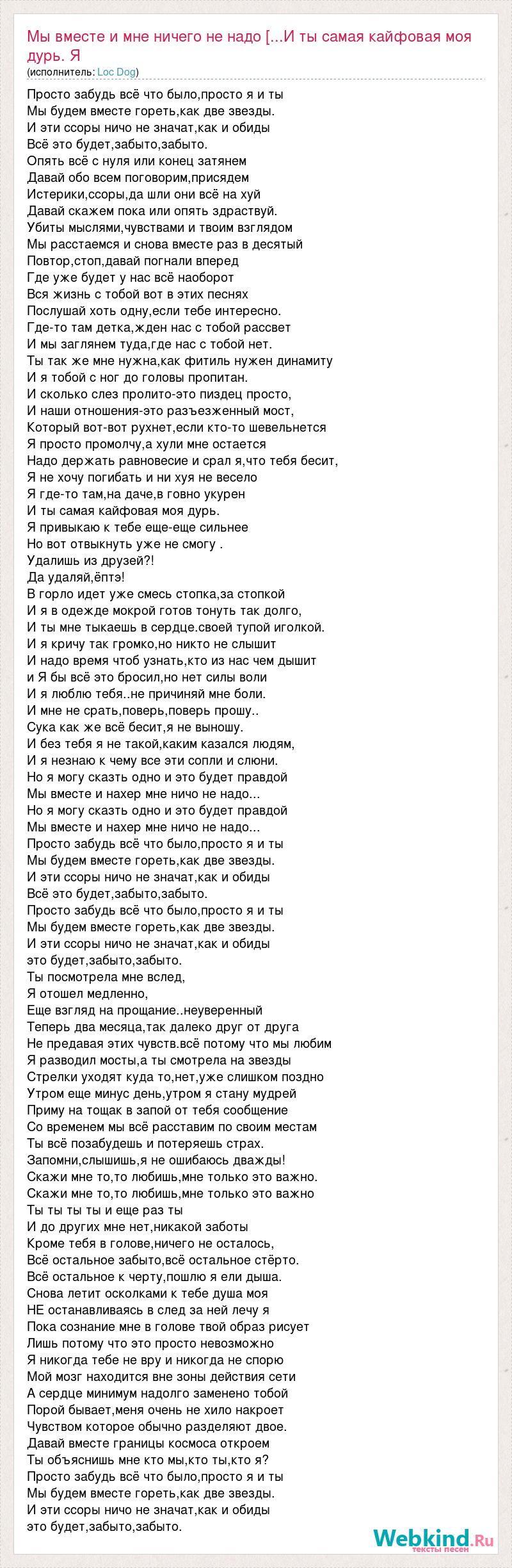 Просто забудь всё что было,просто я и ты Мы будем вместе гореть,как две звезды. И эти ссоры ничо не значат,как и обиды Всё это будет,забыто,забыто. Опять всё с нуля или конец затянем Давай обо всем поговорим,присядем Истерики,ссоры,да шли они всё на хуй Давай скажем пока или опять здраствуй. Убиты мыслями,чувствами и твоим взглядом Мы расстаемся и снова вместе раз в десятый Повтор,стоп,давай погнали вперед Где уже будет у нас всё наоборот Вся жизнь с тобой вот в этих песнях Послушай хоть одну,если тебе интересно. Где-то там детка,жден нас с тобой рассвет И мы заглянем туда,где нас с тобой нет. Ты так же мне нужна,как фитиль нужен динамиту И я тобой с ног до головы пропитан. И сколько слез пролито-это пиздец просто, И наши отношения-это разъезженный мост, Который вот-вот рухнет,если кто-то шевельнется Я просто промолчу,а хули мне остается Надо держать равновесие и срал я,что тебя бесит, Я не хочу погибать и ни хуя не весело Я где-то там,на даче,в говно укурен И ты самая кайфовая моя дурь. Я привыкаю к тебе еще-еще сильнее Но вот отвыкнуть уже не смогу . Удалишь из друзей?! Да удаляй,ёптэ! В горло идет уже смесь стопка,за стопкой И я в одежде мокрой готов тонуть так долго, И ты мне тыкаешь в сердце.своей тупой иголкой. И я кричу так громко,но никто не слышит И надо время чтоб узнать,кто из нас чем дышит и Я бы всё это бросил,но нет силы воли И я люблю тебя..не причиняй мне боли. И мне не срать,поверь,поверь прошу.. Сука как же всё бесит,я не выношу. И без тебя я не такой,каким казался людям, И я незнаю к чему все эти сопли и слюни. Но я могу сказть одно и это будет правдой Мы вместе и нахер мне ничо не надо... Но я могу сказть одно и это будет правдой Мы вместе и нахер мне ничо не надо... Просто забудь всё что было,просто я и ты Мы будем вместе гореть,как две звезды. И эти ссоры ничо не значат,как и обиды Всё это будет,забыто,забыто. Просто забудь всё что было,просто я и ты Мы будем вместе гореть,как две звезды. И эти ссоры ничо не значат,как и обиды это будет,забыто,забыто. Ты посмотрела мне вслед, Я отошел медленно, Еще взгляд на прощание..неуверенный Теперь два месяца,так далеко друг от друга Не предавая этих чувств.всё потому что мы любим Я разводил мосты,а ты смотрела на звезды Стрелки уходят куда то,нет,уже слишком поздно Утром еще минус день,утром я стану мудрей Приму на тощак в запой от тебя сообщение Со временем мы всё расставим по своим местам Ты всё позабудешь и потеряешь страх. Запомни,слышишь,я не ошибаюсь дважды! Скажи мне то,то любишь,мне только это важно. Скажи мне то,то любишь,мне только это важно Ты ты ты ты и еще раз ты И до других мне нет,никакой заботы Кроме тебя в голове,ничего не осталось, Всё остальное забыто,всё остальное стёрто. Всё остальное к черту,пошлю я ели дыша. Снова летит осколками к тебе душа моя НЕ останавливаясь в след за ней лечу я Пока сознание мне в голове твой образ рисует Лишь потому что это просто невозможно Я никогда тебе не вру и никогда не спорю Мой мозг находится вне зоны действия сети А сердце минимум надолго заменено тобой Порой бывает,меня очень не хило накроет Чувством которое обычно разделяют двое. Давай вместе границы космоса откроем Ты объяснишь мне кто мы,кто ты,кто я? Просто забудь всё что было,просто я и ты Мы будем вместе гореть,как две звезды. И эти ссоры ничо не значат,как и обиды это будет,забыто,забыто.