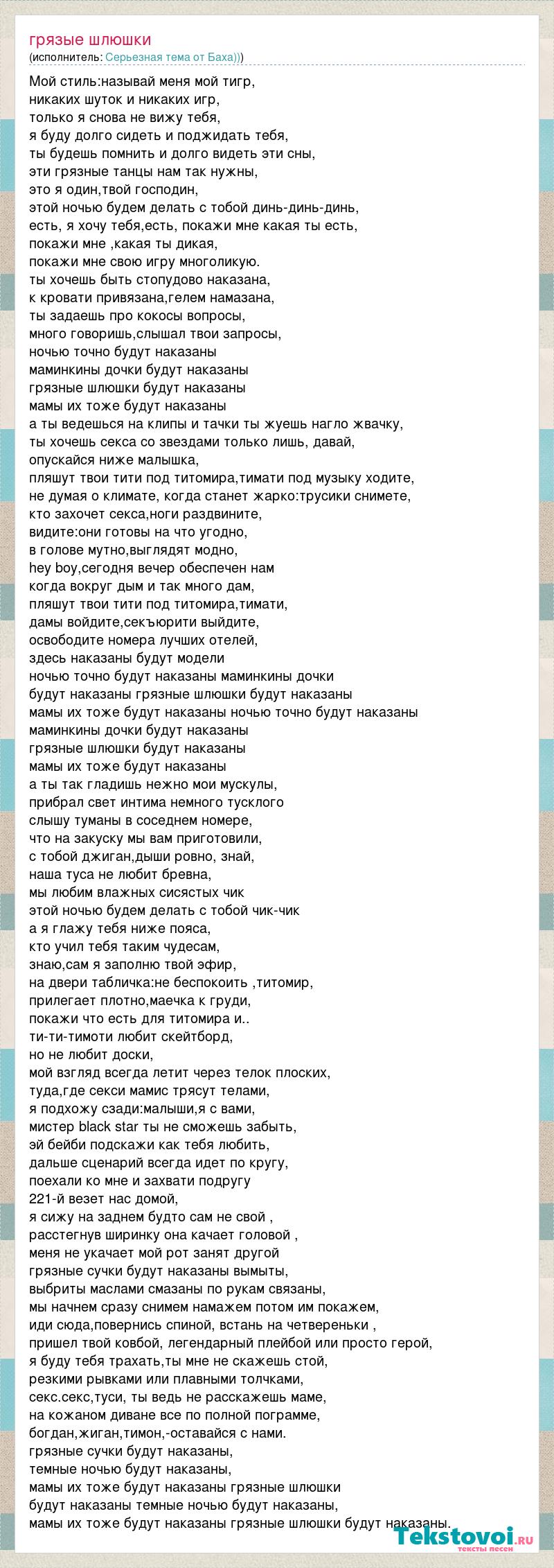 Мой стиль:называй меня мой тигр, никаких шуток и никаких игр, только я снова не вижу тебя, я буду долго сидеть и поджидать тебя, ты будешь помнить и долго видеть эти сны, эти грязные танцы нам так нужны, это я один,твой господин, этой ночью будем делать с тобой динь-динь-динь, есть, я хочу тебя,есть, покажи мне какая ты есть, покажи мне ,какая ты дикая, покажи мне свою игру многоликую. ты хочешь быть стопудово наказана, к кровати привязана,гелем намазана, ты задаешь про кокосы вопросы, много говоришь,слышал твои запросы, ночью точно будут наказаны маминкины дочки будут наказаны грязные шлюшки будут наказаны мамы их тоже будут наказаны а ты ведешься на клипы и тачки ты жуешь нагло жвачку, ты хочешь секса со звездами только лишь, давай, опускайся ниже малышка, пляшут твои тити под титомира,тимати под музыку ходите, не думая о климате, когда станет жарко:трусики снимете, кто захочет секса,ноги раздвините, видите:они готовы на что угодно, в голове мутно,выглядят модно, hey boy,сегодня вечер обеспечен нам когда вокруг дым и так много дам, пляшут твои тити под титомира,тимати, дамы войдите,секъюрити выйдите, освободите номера лучших отелей, здесь наказаны будут модели ночью точно будут наказаны маминкины дочки будут наказаны грязные шлюшки будут наказаны мамы их тоже будут наказаны ночью точно будут наказаны маминкины дочки будут наказаны грязные шлюшки будут наказаны мамы их тоже будут наказаны а ты так гладишь нежно мои мускулы, прибрал свет интима немного тусклого слышу туманы в соседнем номере, что на закуску мы вам приготовили, с тобой джиган,дыши ровно, знай, наша туса не любит бревна, мы любим влажных сисястых чик этой ночью будем делать с тобой чик-чик а я глажу тебя ниже пояса, кто учил тебя таким чудесам, знаю,сам я заполню твой эфир, на двери табличка:не беспокоить ,титомир, прилегает плотно,маечка к груди, покажи что есть для титомира и.. ти-ти-тимоти любит скейтборд, но не любит доски, мой взгляд всегда летит через телок плоских, туда,где секси мамис трясут телами, я подхожу сзади:малыши,я с вами, мистер black star ты не сможешь забыть, эй бейби подскажи как тебя любить, дальше сценарий всегда идет по кругу, поехали ко мне и захвати подругу 221-й везет нас домой, я сижу на заднем будто сам не свой , расстегнув ширинку она качает головой , меня не укачает мой рот занят другой грязные сучки будут наказаны вымыты, выбриты маслами смазаны по рукам связаны, мы начнем сразу снимем намажем потом им покажем, иди сюда,повернись спиной, встань на четвереньки , пришел твой ковбой, легендарный плейбой или просто герой, я буду тебя трахать,ты мне не скажешь стой, резкими рывками или плавными толчками, секс.секс,туси, ты ведь не расскажешь маме, на кожаном диване все по полной пограмме, богдан,жиган,тимон,-оставайся с нами. грязные сучки будут наказаны, темные ночью будут наказаны, мамы их тоже будут наказаны грязные шлюшки будут наказаны темные ночью будут наказаны, мамы их тоже будут наказаны грязные шлюшки будут наказаны.