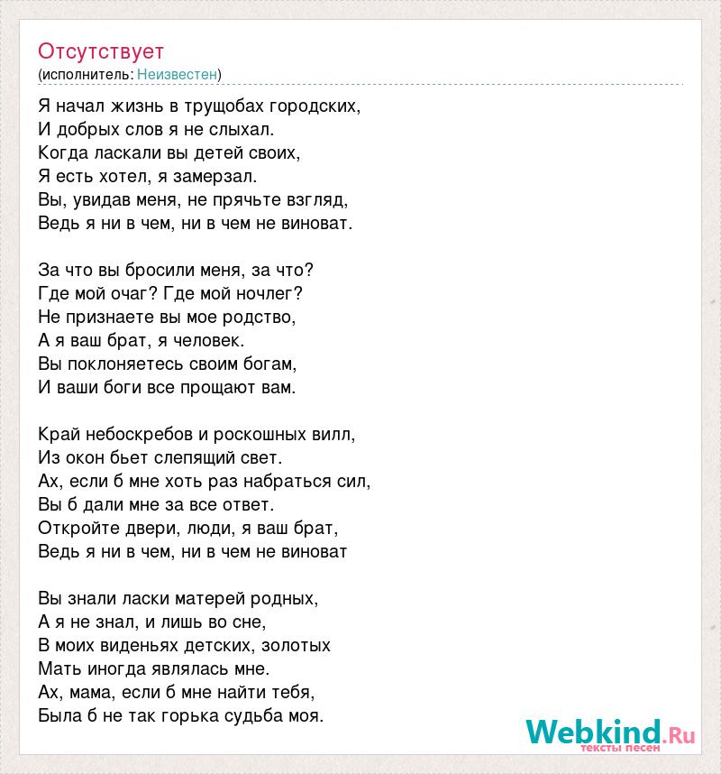 Я начал жизнь в трущобах городских, И добрых слов я не слыхал. Когда ласкали вы детей своих, Я есть хотел, я замерзал. Вы, увидав меня, не прячьте взгляд, Ведь я ни в чем, ни в чем не виноват. За что вы бросили меня, за что? Где мой очаг? Где мой ночлег? Не признаете вы мое родство, А я ваш брат, я человек. Вы поклоняетесь своим богам, И ваши боги все прощают вам. Край небоскребов и роскошных вилл, Из окон бьет слепящий свет. Ах, если б мне хоть раз набраться сил, Вы б дали мне за все ответ. Откройте двери, люди, я ваш брат, Ведь я ни в чем, ни в чем не виноват Вы знали ласки матерей родных, А я не знал, и лишь во сне, В моих виденьях детских, золотых Мать иногда являлась мне. Ах, мама, если б мне найти тебя, Была б не так горька судьба моя.
