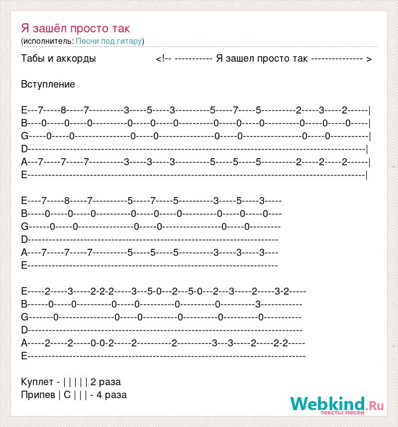 Табы и аккорды <!-- ----------- Я зашел просто так --------------- > Вступление E---7-----8-----7----------3-----5-----3----------5-----7-----5----------2-----3-----2------| B----0-----0-----0----------0-----0-----0----------0-----0-----0----------0-----0-----0-----| G-----0-----0----------------0-----0----------------0-----0-----------------0-----0-----------| D-------------------------------------------------------------------------------------------------| A---7-----7-----7----------3-----3-----3----------5-----5-----5----------2-----2-----2------| E-------------------------------------------------------------------------------------------------| E----7-----8-----7----------5-----7-----5----------3-----5-----3----- B-----0-----0-----0----------0-----0-----0----------0-----0-----0---- G------0-----0----------------0-----0-----------------0-----0--------- D------------------------------------------------------------------------ A----7-----7-----7----------5-----5-----5----------3-----3-----3---- E------------------------------------------------------------------------ E-----2-----3-----2-2-2-----3---5-0---2---5-0---2---3-----2-----3-2----- B------0-----0----------0-----0----------0----------0----------3------------ G-------0----------------0-----0----------0----------0----------0----------- D------------------------------------------------------------------------------- A-----2-----2-----0-0-2-----2----------2----------3---3-----2-----2-2----- E-------------------------------------------------------------------------------- Куплет - | | | | | 2 раза Припев | С | | | - 4 раза
