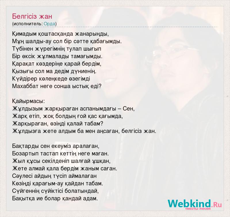 Қимадым қоштасқанда жанарыңды, Мұң шалды-ау сол бір сәтте қабағымды. Түбінен жүрегімнің тулап шығып Бір өксік жұлмалады тамағымды. Қарақат көздеріңе қарай бердім, Қызығы сол ма дедім дүниенің. Күйдірер көлеңкеде өзегімді Махаббат неге сонша ыстық еді? Қайырмасы: Жұлдызым жарқыраған аспанымдағы – Сен, Жарқ етіп, жоқ болдың ғой қас қағымда, Жарқыраған, өзіңді қалай табам? Жұлдызға жете алдым ба мен аңсаған, белгісіз жан. Бақтарды сен екеуміз аралаған, Бозартып тастап кеттің неге маған. Жыл құсы секілденіп шалғай ұшқан, Жете алмай қала бердім жаным саған. Сәулесі айдың түсіп аймалаған Көзіңді қарағым-ау қайдан табам. Сүйгеннің сүйіктісі болатындай, Бақытқа ие болар қандай адам.