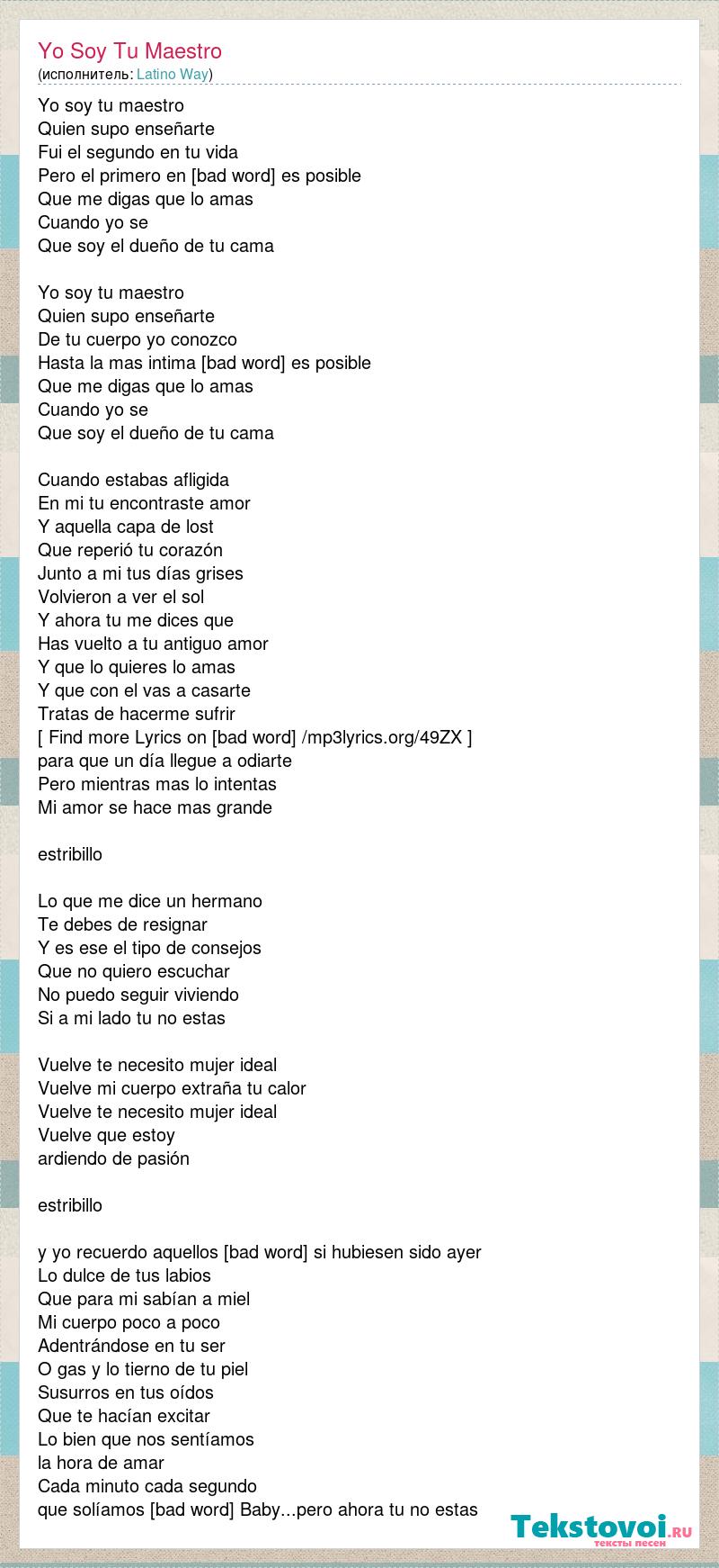 Yo soy tu maestro Quien supo enseñarte Fui el segundo en tu vida Pero el primero en amarte Como es posible Que me digas que lo amas Cuando yo se Que soy el dueño de tu cama Yo soy tu maestro Quien supo enseñarte De tu cuerpo yo conozco Hasta la mas intima parte Como es posible Que me digas que lo amas Cuando yo se Que soy el dueño de tu cama Cuando estabas afligida En mi tu encontraste amor Y aquella capa de lost Que reperió tu corazón Junto a mi tus días grises Volvieron a ver el sol Y ahora tu me dices que Has vuelto a tu antiguo amor Y que lo quieres lo amas Y que con el vas a casarte Tratas de hacerme sufrir [ Find more Lyrics on [bad word] /mp3lyrics.org/49ZX ] para que un día llegue a odiarte Pero mientras mas lo intentas Mi amor se hace mas grande estribillo Lo que me dice un hermano Te debes de resignar Y es ese el tipo de consejos Que no quiero escuchar No puedo seguir viviendo Si a mi lado tu no estas Vuelve te necesito mujer ideal Vuelve mi cuerpo extraña tu calor Vuelve te necesito mujer ideal Vuelve que estoy ardiendo de pasión estribillo y yo recuerdo aquellos besos Como si hubiesen sido ayer Lo dulce de tus labios Que para mi sabían a miel Mi cuerpo poco a poco Adentrándose en tu ser O gas y lo tierno de tu piel Susurros en tus oídos Que te hacían excitar Lo bien que nos sentíamos la hora de amar Cada minuto cada segundo que solíamos disfrutar Baby...pero ahora tu no estas