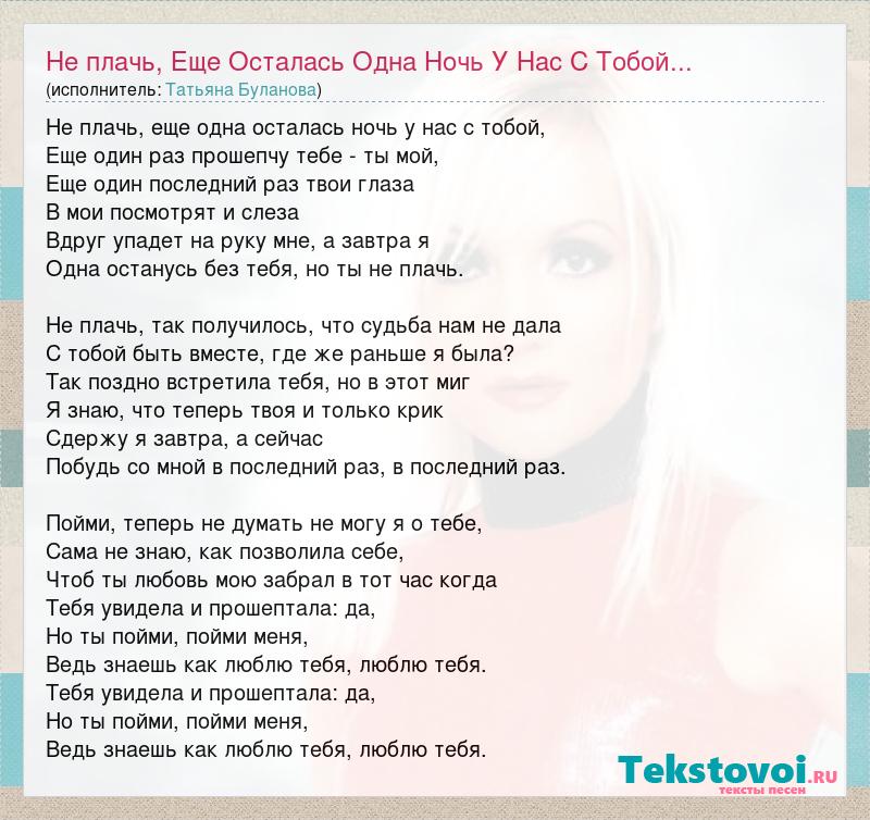 Не плачь, еще одна осталась ночь у нас с тобой, Еще один раз прошепчу тебе - ты мой, Еще один последний раз твои глаза В мои посмотрят и слеза Вдруг упадет на руку мне, а завтра я Одна останусь без тебя, но ты не плачь. Не плачь, так получилось, что судьба нам не дала С тобой быть вместе, где же раньше я была? Так поздно встретила тебя, но в этот миг Я знаю, что теперь твоя и только крик Сдержу я завтра, а сейчас Побудь со мной в последний раз, в последний раз. Пойми, теперь не думать не могу я о тебе, Сама не знаю, как позволила себе, Чтоб ты любовь мою забрал в тот час когда Тебя увидела и прошептала: да, Но ты пойми, пойми меня, Ведь знаешь как люблю тебя, люблю тебя. Тебя увидела и прошептала: да, Но ты пойми, пойми меня, Ведь знаешь как люблю тебя, люблю тебя.