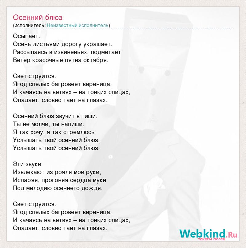 Осыпает. Осень листьями дорогу украшает. Рассыпаясь в извиненьях, подметает Ветер красочные пятна октября. Свет струится. Ягод спелых багровеет вереница, И качаясь на ветвях – на тонких спицах, Опадает, словно тает на глазах. Осенний блюз звучит в тиши. Ты не молчи, ты напиши. Я так хочу, я так стремлюсь Услышать твой осенний блюз, Услышать твой осенний блюз. Эти звуки Извлекают из рояля мои руки, Испаряя, прогоняя сердца муки Под мелодию осеннего дождя. Свет струится. Ягод спелых багровеет вереница, И качаясь на ветвях – на тонких спицах, Опадает, словно тает на глазах.