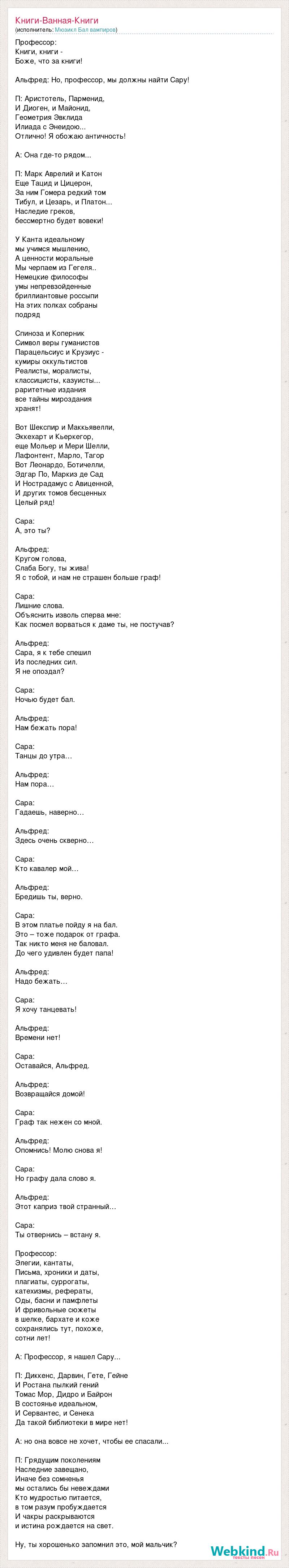 Профессор: Книги, книги - Боже, что за книги! Альфред: Но, профессор, мы должны найти Сару! П: Аристотель, Парменид, И Диоген, и Майонид, Геометрия Эвклида Илиада с Энеидою... Отлично! Я обожаю античность! А: Она где-то рядом... П: Марк Аврелий и Катон Еще Тацид и Цицерон, За ним Гомера редкий том Тибул, и Цезарь, и Платон... Наследие греков, бессмертно будет вовеки! У Канта идеальному мы учимся мышлению, А ценности моральные Мы черпаем из Гегеля.. Немецкие философы умы непревзойденные бриллиантовые россыпи На этих полках собраны подряд Спиноза и Коперник Символ веры гуманистов Парацельсиус и Крузиус - кумиры оккультистов Реалисты, моралисты, классицисты, казуисты... раритетные издания все тайны мироздания хранят! Вот Шекспир и Маккьявелли, Эккехарт и Кьеркегор, еще Мольер и Мери Шелли, Лафонтент, Марло, Тагор Вот Леонардо, Ботичелли, Эдгар По, Маркиз де Сад И Нострадамус с Авиценной, И других томов бесценных Целый ряд! Сара: А, это ты? Альфред: Кругом голова, Слаба Богу, ты жива! Я с тобой, и нам не страшен больше граф! Сара: Лишние слова. Объяснить изволь сперва мне: Как посмел ворваться к даме ты, не постучав? Альфред: Сара, я к тебе спешил Из последних сил. Я не опоздал? Сара: Ночью будет бал. Альфред: Нам бежать пора! Сара: Танцы до утра… Альфред: Нам пора… Сара: Гадаешь, наверно… Альфред: Здесь очень скверно… Сара: Кто кавалер мой… Альфред: Бредишь ты, верно. Сара: В этом платье пойду я на бал. Это – тоже подарок от графа. Так никто меня не баловал. До чего удивлен будет папа! Альфред: Надо бежать… Сара: Я хочу танцевать! Альфред: Времени нет! Сара: Оставайся, Альфред. Альфред: Возвращайся домой! Сара: Граф так нежен со мной. Альфред: Опомнись! Молю снова я! Сара: Но графу дала слово я. Альфред: Этот каприз твой странный… Сара: Ты отвернись – встану я. Профессор: Элегии, кантаты, Письма, хроники и даты, плагиаты, суррогаты, катехизмы, рефераты, Оды, басни и памфлеты И фривольные сюжеты в шелке, бархате и коже сохранялись тут, похоже, сотни лет! А: Профессор, я нашел Сару... П: Диккенс, Дарвин, Гете, Гейне И Ростана пылкий гений Томас Мор, Дидро и Байрон В состоянье идеальном, И Сервантес, и Сенека Да такой библиотеки в мире нет! А: но она вовсе не хочет, чтобы ее спасали... П: Грядущим поколениям Наследние завещано, Иначе без сомненья мы остались бы невеждами Кто мудростью питается, в том разум пробуждается И чакры раскрываются и истина рождается на свет. Ну, ты хорошенько запомнил это, мой мальчик?