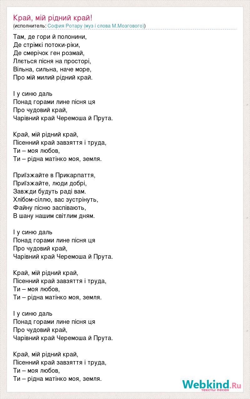 Там, де гори й полонини, Де стрiмкi потоки-рiки, Де смерiчок ген розмай, Ллється пiсня на просторi, Вiльна, сильна, наче море, Про мiй милий рiдний край. I у синю даль Понад горами лине пiсня ця Про чудовий край, Чарiвний край Черемоша й Прута. Край, мiй рiдний край, Пiсенний край завзяття i труда, Ти – моя любов, Ти – рiдна матiнко моя, земля. Приїзжайте в Прикарпаття, Приїзжайте, люди добрi, Завжди будуть радi вам. Хлiбом-сiллю, вас зустрiнуть, Файну пiсню заспiвають, В шану нашим свiтлим дням. I у синю даль Понад горами лине пiсня ця Про чудовий край, Чарiвний край Черемоша й Прута. Край, мiй рiдний край, Пiсенний край завзяття i труда, Ти – моя любов, Ти – рiдна матiнко моя, земля. I у синю даль Понад горами лине пiсня ця Про чудовий край, Чарiвний край Черемоша й Прута. Край, мiй рiдний край, Пiсенний край завзяття i труда, Ти – моя любов, Ти – рiдна матiнко моя, земля.