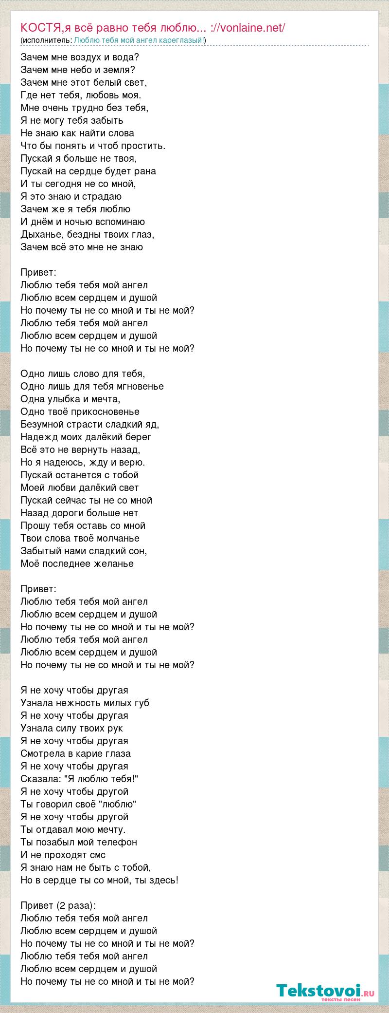 Зачем мне воздух и вода? Зачем мне небо и земля? Зачем мне этот белый свет, Где нет тебя, любовь моя. Мне очень трудно без тебя, Я не могу тебя забыть Не знаю как найти слова Что бы понять и чтоб простить. Пускай я больше не твоя, Пускай на сердце будет рана И ты сегодня не со мной, Я это знаю и страдаю Зачем же я тебя люблю И днём и ночью вспоминаю Дыханье, бездны твоих глаз, Зачем всё это мне не знаю Привет: Люблю тебя тебя мой ангел Люблю всем сердцем и душой Но почему ты не со мной и ты не мой? Люблю тебя тебя мой ангел Люблю всем сердцем и душой Но почему ты не со мной и ты не мой? Одно лишь слово для тебя, Одно лишь для тебя мгновенье Одна улыбка и мечта, Одно твоё прикосновенье Безумной страсти сладкий яд, Надежд моих далёкий берег Всё это не вернуть назад, Но я надеюсь, жду и верю. Пускай останется с тобой Моей любви далёкий свет Пускай сейчас ты не со мной Назад дороги больше нет Прошу тебя оставь со мной Твои слова твоё молчанье Забытый нами сладкий сон, Моё последнее желанье Привет: Люблю тебя тебя мой ангел Люблю всем сердцем и душой Но почему ты не со мной и ты не мой? Люблю тебя тебя мой ангел Люблю всем сердцем и душой Но почему ты не со мной и ты не мой? Я не хочу чтобы другая Узнала нежность милых губ Я не хочу чтобы другая Узнала силу твоих рук Я не хочу чтобы другая Смотрела в карие глаза Я не хочу чтобы другая Сказала: "Я люблю тебя!" Я не хочу чтобы другой Ты говорил своё "люблю" Я не хочу чтобы другой Ты отдавал мою мечту. Ты позабыл мой телефон И не проходят смс Я знаю нам не быть с тобой, Но в сердце ты со мной, ты здесь! Привет (2 раза): Люблю тебя тебя мой ангел Люблю всем сердцем и душой Но почему ты не со мной и ты не мой? Люблю тебя тебя мой ангел Люблю всем сердцем и душой Но почему ты не со мной и ты не мой?
