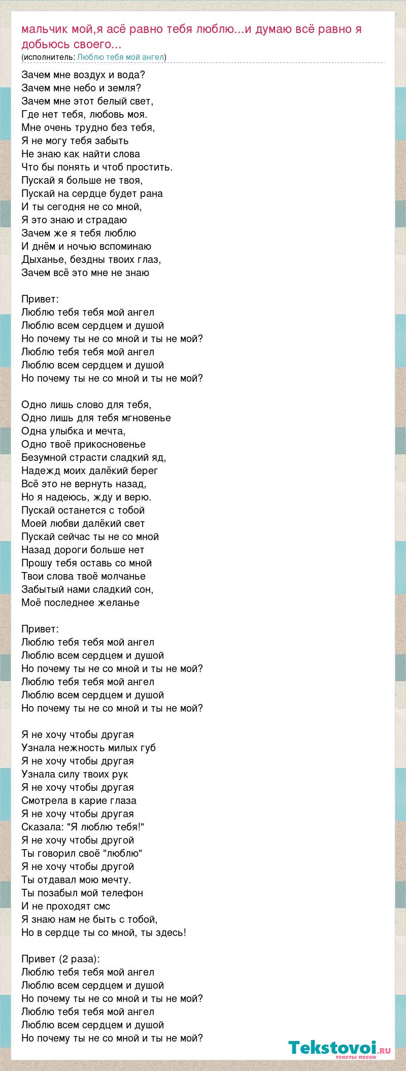 Зачем мне воздух и вода? Зачем мне небо и земля? Зачем мне этот белый свет, Где нет тебя, любовь моя. Мне очень трудно без тебя, Я не могу тебя забыть Не знаю как найти слова Что бы понять и чтоб простить. Пускай я больше не твоя, Пускай на сердце будет рана И ты сегодня не со мной, Я это знаю и страдаю Зачем же я тебя люблю И днём и ночью вспоминаю Дыханье, бездны твоих глаз, Зачем всё это мне не знаю Привет: Люблю тебя тебя мой ангел Люблю всем сердцем и душой Но почему ты не со мной и ты не мой? Люблю тебя тебя мой ангел Люблю всем сердцем и душой Но почему ты не со мной и ты не мой? Одно лишь слово для тебя, Одно лишь для тебя мгновенье Одна улыбка и мечта, Одно твоё прикосновенье Безумной страсти сладкий яд, Надежд моих далёкий берег Всё это не вернуть назад, Но я надеюсь, жду и верю. Пускай останется с тобой Моей любви далёкий свет Пускай сейчас ты не со мной Назад дороги больше нет Прошу тебя оставь со мной Твои слова твоё молчанье Забытый нами сладкий сон, Моё последнее желанье Привет: Люблю тебя тебя мой ангел Люблю всем сердцем и душой Но почему ты не со мной и ты не мой? Люблю тебя тебя мой ангел Люблю всем сердцем и душой Но почему ты не со мной и ты не мой? Я не хочу чтобы другая Узнала нежность милых губ Я не хочу чтобы другая Узнала силу твоих рук Я не хочу чтобы другая Смотрела в карие глаза Я не хочу чтобы другая Сказала: "Я люблю тебя!" Я не хочу чтобы другой Ты говорил своё "люблю" Я не хочу чтобы другой Ты отдавал мою мечту. Ты позабыл мой телефон И не проходят смс Я знаю нам не быть с тобой, Но в сердце ты со мной, ты здесь! Привет (2 раза): Люблю тебя тебя мой ангел Люблю всем сердцем и душой Но почему ты не со мной и ты не мой? Люблю тебя тебя мой ангел Люблю всем сердцем и душой Но почему ты не со мной и ты не мой?