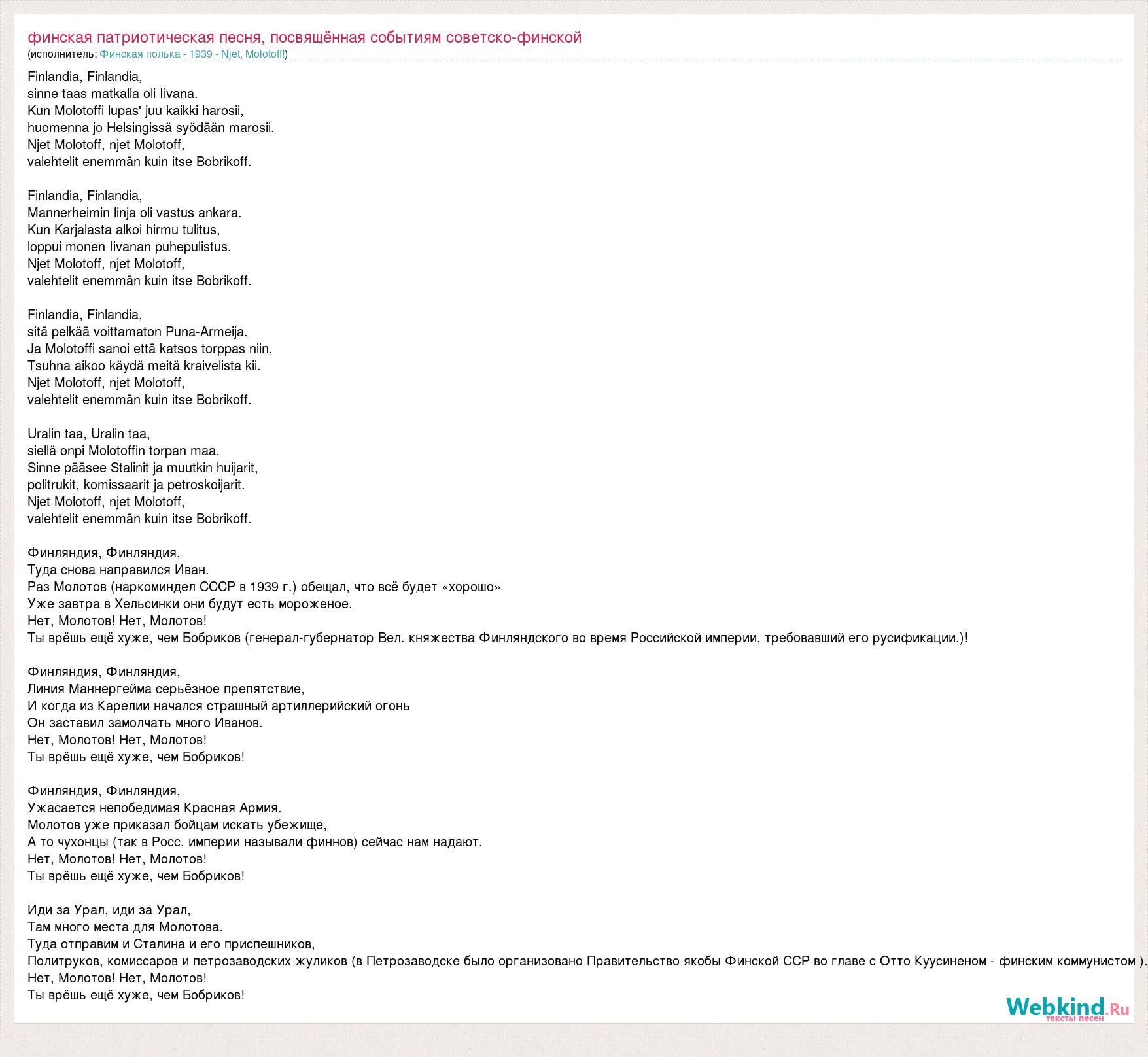 Finlandia, Finlandia, sinne taas matkalla oli Iivana. Kun Molotoffi lupas' juu kaikki harosii, huomenna jo Helsingissä syödään marosii. Njet Molotoff, njet Molotoff, valehtelit enemmän kuin itse Bobrikoff. Finlandia, Finlandia, Mannerheimin linja oli vastus ankara. Kun Karjalasta alkoi hirmu tulitus, loppui monen Iivanan puhepulistus. Njet Molotoff, njet Molotoff, valehtelit enemmän kuin itse Bobrikoff. Finlandia, Finlandia, sitä pelkää voittamaton Puna-Armeija. Ja Molotoffi sanoi että katsos torppas niin, Tsuhna aikoo käydä meitä kraivelista kii. Njet Molotoff, njet Molotoff, valehtelit enemmän kuin itse Bobrikoff. Uralin taa, Uralin taa, siellä onpi Molotoffin torpan maa. Sinne pääsee Stalinit ja muutkin huijarit, politrukit, komissaarit ja petroskoijarit. Njet Molotoff, njet Molotoff, valehtelit enemmän kuin itse Bobrikoff. Финляндия, Финляндия, Туда снова направился Иван. Раз Молотов (наркоминдел СССР в 1939 г.) обещал, что всё будет «хорошо» Уже завтра в Хельсинки они будут есть мороженое. Нет, Молотов! Нет, Молотов! Ты врёшь ещё хуже, чем Бобриков (генерал-губернатор Вел. княжества Финляндского во время Российской империи, требовавший его русификации.)! Финляндия, Финляндия, Линия Маннергейма серьёзное препятствие, И когда из Карелии начался страшный артиллерийский огонь Он заставил замолчать много Иванов. Нет, Молотов! Нет, Молотов! Ты врёшь ещё хуже, чем Бобриков! Финляндия, Финляндия, Ужасается непобедимая Красная Армия. Молотов уже приказал бойцам искать убежище, А то чухонцы (так в Росс. империи называли финнов) сейчас нам надают. Нет, Молотов! Нет, Молотов! Ты врёшь ещё хуже, чем Бобриков! Иди за Урал, иди за Урал, Там много места для Молотова. Туда отправим и Сталина и его приспешников, Политруков, комиссаров и петрозаводских жуликов (в Петрозаводске было организовано Правительство якобы Финской ССР во главе с Отто Куусиненом - финским коммунистом ). Нет, Молотов! Нет, Молотов! Ты врёшь ещё хуже, чем Бобриков!