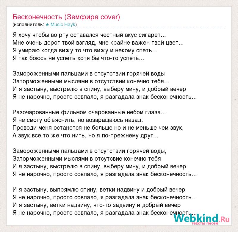 Я хочу чтобы во рту оставался честный вкус сигарет... Мне очень дорог твой взгляд, мне крайне важен твой цвет... Я умираю когда вижу то что вижу и некому спеть... Я так боюсь не успеть хотя бы что-то успеть... Замороженными пальцами в отсутствии горячей воды Заторможенными мыслями в отсутствии конечно тебя... И я застыну, выстрелю в спину, выберу мину, и добрый вечер Я не нарочно, просто совпало, я разгадала знак бесконечность... Разочарованные фильмом очарованные небом глаза... Я не смогу объяснить, но возвращаюсь назад. Проводи меня останется не больше но и не меньше чем звук, А звук все то же что нить, но я по-прежнему друг... Замороженными пальцами в отсутствии горячей воды, Заторможенными мыслями в отсутсвие конечно тебя И я застыну, выстрелю в спину, выберу мину, и добрый вечер Я не нарочно, просто совпало, я разгадала знак бесконечность... И я застыну, выпрямлю спину, ветки надвину и добрый вечер Я не нарочно, просто совпало, я разгадала знак бесконечность... И я застыну, ветки надвину, что-то задвину и добрый вечер Я не нарочно, просто совпало, я разгадала знак бесконечность...