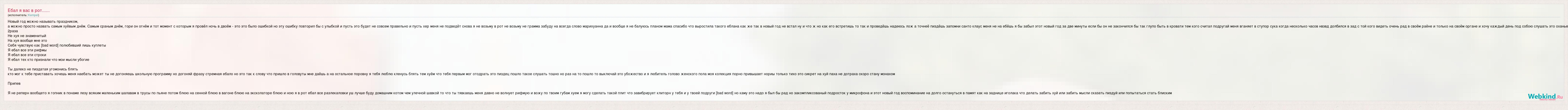 Новый год можно называть праздником, а можно просто назвать самым хуёвым днём. Самым сраным днём, гори он огнём и тот момент с которым я провёл ночь в двоём - это это было ошибкой но эту ошибку повторил бы с улыбкой и пусть это будет не совсем правельно и пусть хер меня не подведёт снова я не возьму в рот не возьму не грамма забуду на всегда слово марихуанна да и вообще я не балуюсь планом мама спасибо что выростила такого еблана как же так в новый год не встал ну и что ж но как его встретишь то так и проведёшь надеюсь лож а точнеё пиздёшь запомни санто клаус меня не на ебёшь я бы забыл этот новый год за две минуты если бы он не закончился бы так глупо быть в кровати тем кого считал подругай меня вганяет в ступор сука когда несколько часов нвзвд долбился в зад с той кого видеть очень рад в своём раёне и только на своём органе и хочу каждый день под собою слушать это оханье 2раза Не хуя не знаменитый На хуя вообще мне это Себя чувствую как [bad word] полюбивший лишь куплеты Я ебал все эти рифмы Я ебал все эти строки Я ебал тех кто признали что мои мысли убогие Ты далеко не пиздатая угомонись блять кто мог к тебе приставать хочешь меня наебать может ты не догоняешь школьную программу но догоняй фразу стремная ебало но это так к слову что пришло в головуты мне даёшь а на остальное поровну я тебя люблю кленусь блять тем хуём что тебя первым мог отодрать это пиздец пошло такое слушать тошно но раз на то пошло то выключай это убожество и я любитель голово женского пола моя колекция порно привышает нориы только тихо это сикрет на хуй паха не дотраха скоро стану монахом Припев Я не реперн вообщето я гопник в понаме лезу всяким маленьким шалавам в трусы по пьяне потом блюю на сенной блюю в вагоне блюю на эксколаторе блюю и ною я в рот ебал все разлекаловки уш лучше буду домашним котом чем улечной шавкой то что ты тявкаешь меня давно не волнует рифмую и вожу по твоим губам хуем я могу сделать такой плит что завибрирует клиторн у тебя и у твоей подруги [bad word] но каму это надо я был бы рад но закомпликсованый подросток у микрофона и этот новый год воспоминание на долго остануться в памят как на заднице иголака что делать забить хуй или забить мысли сказать пиздуй или попытаться стать блиским
