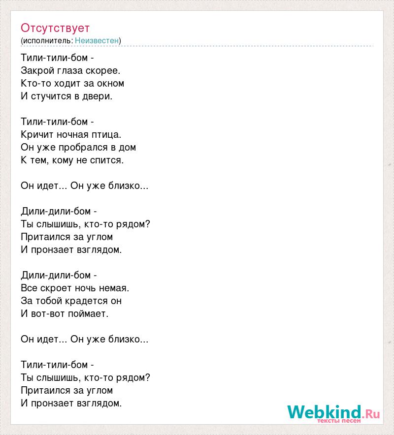 Тили-тили-бом - Закрой глаза скорее. Кто-то ходит за окном И стучится в двери. Тили-тили-бом - Кричит ночная птица. Он уже пробрался в дом К тем, кому не спится. Он идет... Он уже близко... Дили-дили-бом - Ты слышишь, кто-то рядом? Притаился за углом И пронзает взглядом. Дили-дили-бом - Все скроет ночь немая. За тобой крадется он И вот-вот поймает. Он идет... Он уже близко... Тили-тили-бом - Ты слышишь, кто-то рядом? Притаился за углом И пронзает взглядом.