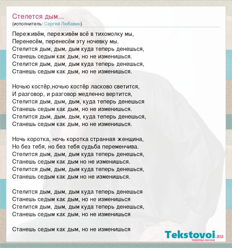 Переживём, переживём всё в тихомолку мы, Перенесём, перенесём эту ночевку мы. Стелится дым, дым, дым куда теперь денешься, Станешь седым как дым, но не изменишься. Стелится дым, дым, дым куда теперь денешься, Станешь седым как дым, но не изменишься. Ночью костёр,ночью костёр ласково светится, И разговор, и разговор медленно вертится, Стелится дым, дым, дым, куда теперь денешься Станешь седым как дым, но не изменишься. Стелится дым, дым, дым, куда теперь денешься, Станешь седым как дым, но не изменишься. Ночь коротка, ночь коротка странная женщина, Но без тебя, но без тебя судьба переменчива. Стелится дым, дым, дым куда теперь денешься, Станешь седым как дым но не изменишься. Стелится дым, дым, дым куда теперь денешься, Станешь седым как дым но не изменишься. Стелится дым, дым, дым куда теперь денешься Станешь седым как дым, но не изменишься Стелится дым, дым, дым куда теперь денешься, Станешь седым как дым, но не изменишься Станешь седым как дым, но не изменишься