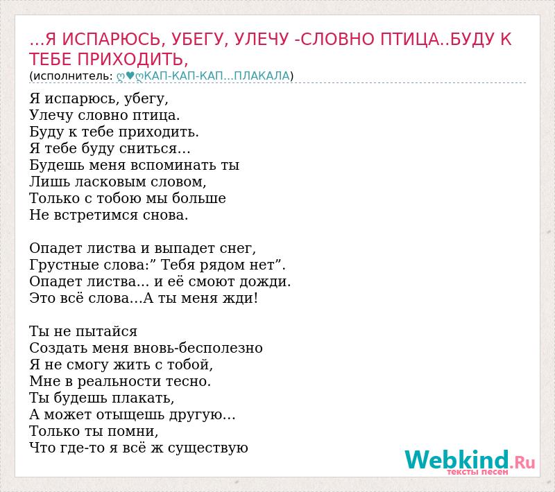 Я испарюсь, убегу, Улечу словно птица. Буду к тебе приходить. Я тебе буду сниться… Будешь меня вспоминать ты Лишь ласковым словом, Только с тобою мы больше Не встретимся снова. Опадет листва и выпадет снег, Грустные слова:” Тебя рядом нет”. Опадет листва... и её смоют дожди. Это всё слова…А ты меня жди! Ты не пытайся Создать меня вновь-бесполезно Я не смогу жить с тобой, Мне в реальности тесно. Ты будешь плакать, А может отыщешь другую… Только ты помни, Что где-то я всё ж существую