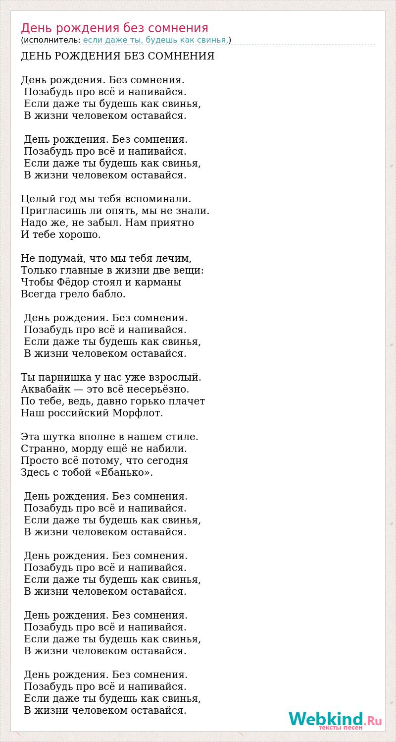 ДЕНЬ РОЖДЕНИЯ БЕЗ СОМНЕНИЯ День рождения. Без сомнения. Позабудь про всё и напивайся. Если даже ты будешь как свинья, В жизни человеком оставайся. День рождения. Без сомнения. Позабудь про всё и напивайся. Если даже ты будешь как свинья, В жизни человеком оставайся. Целый год мы тебя вспоминали. Пригласишь ли опять, мы не знали. Надо же, не забыл. Нам приятно И тебе хорошо. Не подумай, что мы тебя лечим, Только главные в жизни две вещи: Чтобы Фёдор стоял и карманы Всегда грело бабло. День рождения. Без сомнения. Позабудь про всё и напивайся. Если даже ты будешь как свинья, В жизни человеком оставайся. Ты парнишка у нас уже взрослый. Аквабайк — это всё несерьёзно. По тебе, ведь, давно горько плачет Наш российский Морфлот. Эта шутка вполне в нашем стиле. Странно, морду ещё не набили. Просто всё потому, что сегодня Здесь с тобой «Ебанько». День рождения. Без сомнения. Позабудь про всё и напивайся. Если даже ты будешь как свинья, В жизни человеком оставайся. День рождения. Без сомнения. Позабудь про всё и напивайся. Если даже ты будешь как свинья, В жизни человеком оставайся. День рождения. Без сомнения. Позабудь про всё и напивайся. Если даже ты будешь как свинья, В жизни человеком оставайся. День рождения. Без сомнения. Позабудь про всё и напивайся. Если даже ты будешь как свинья, В жизни человеком оставайся.