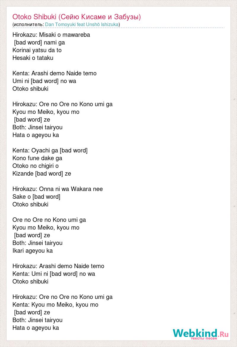 Hirokazu: Misaki o mawareba [bad word] nami ga Korinai yatsu da to Hesaki o tataku Kenta: Arashi demo Naide temo Umi ni [bad word] no wa Otoko shibuki Hirokazu: Ore no Ore no Kono umi ga Kyou mo Meiko, kyou mo [bad word] ze Both: Jinsei tairyou Hata o ageyou ka Kenta: Oyachi ga [bad word] Kono fune dake ga Otoko no chigiri o Kizande [bad word] ze Hirokazu: Onna ni wa Wakara nee Sake o [bad word] Otoko shibuki Ore no Ore no Kono umi ga Kyou mo Meiko, kyou mo [bad word] ze Both: Jinsei tairyou Ikari ageyou ka Hirokazu: Arashi demo Naide temo Kenta: Umi ni [bad word] no wa Otoko shibuki Hirokazu: Ore no Ore no Kono umi ga Kenta: Kyou mo Meiko, kyou mo [bad word] ze Both: Jinsei tairyou Hata o ageyou ka